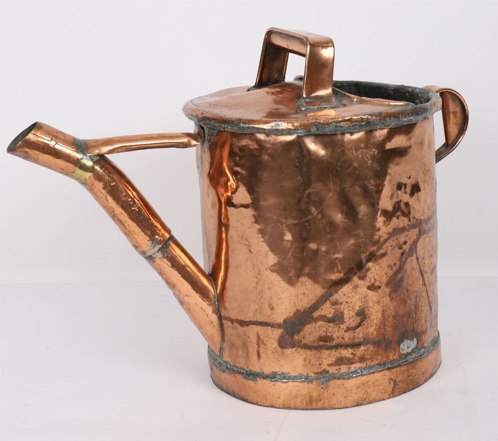 hand-hammered construction with rolled seams and riveted joins, the cylindrical body rising to a wide neck with angular spout and twin side handles.
