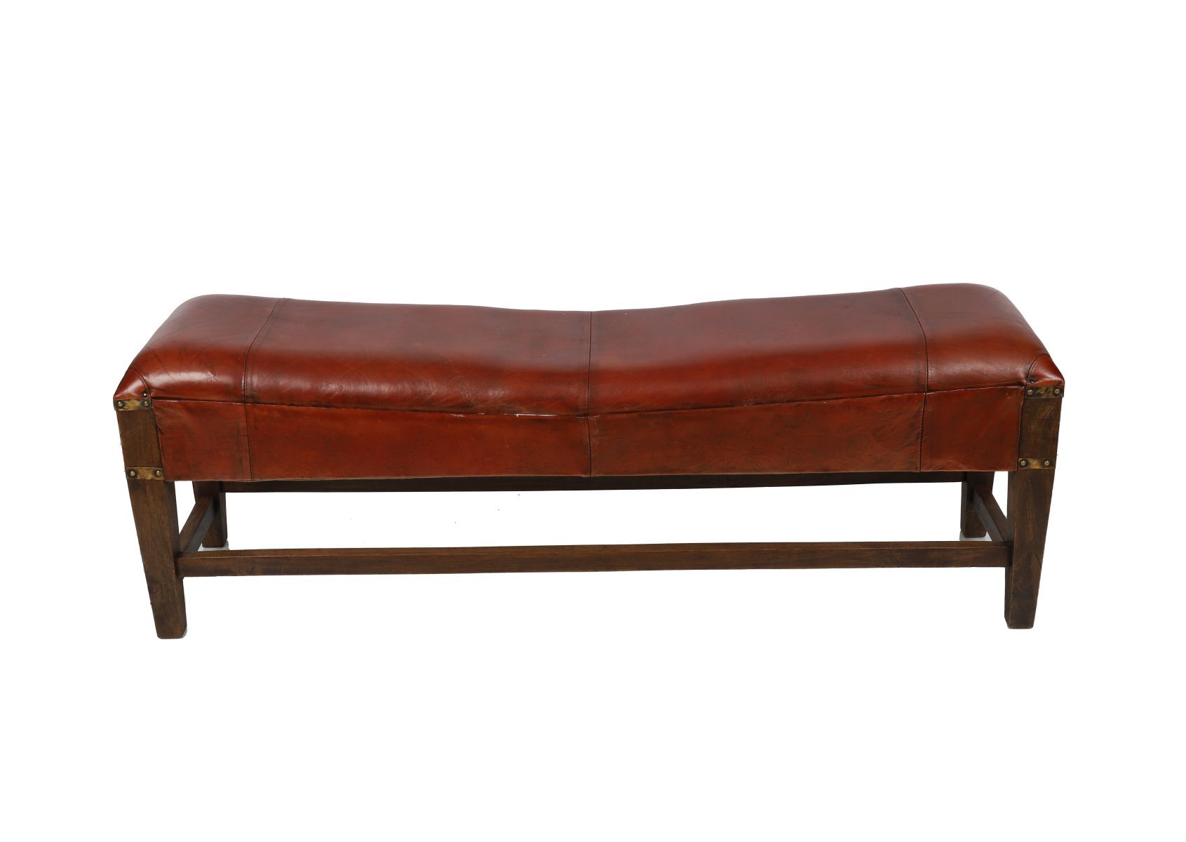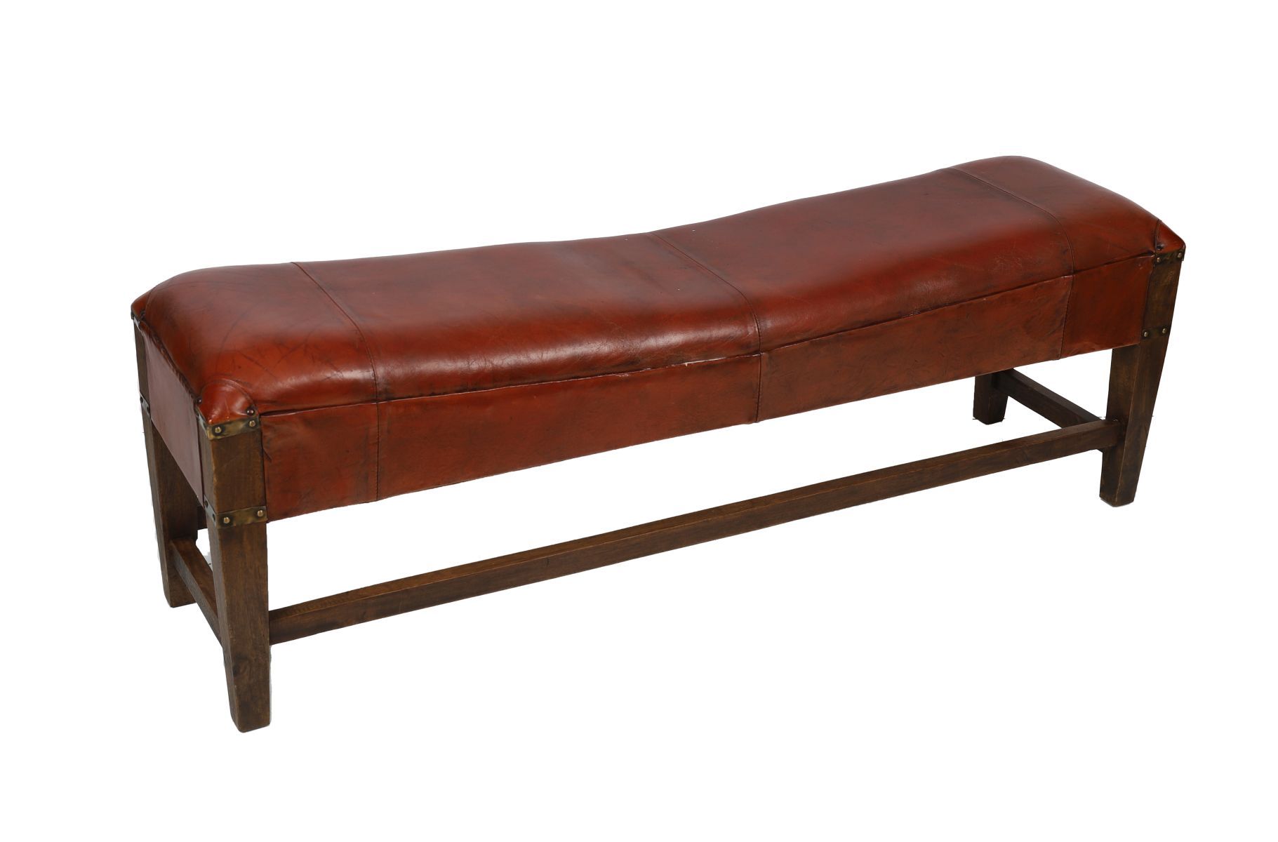 A vintage gymnasium pommel horse, upholstered in tan leather and raised on a stained wooden frame.