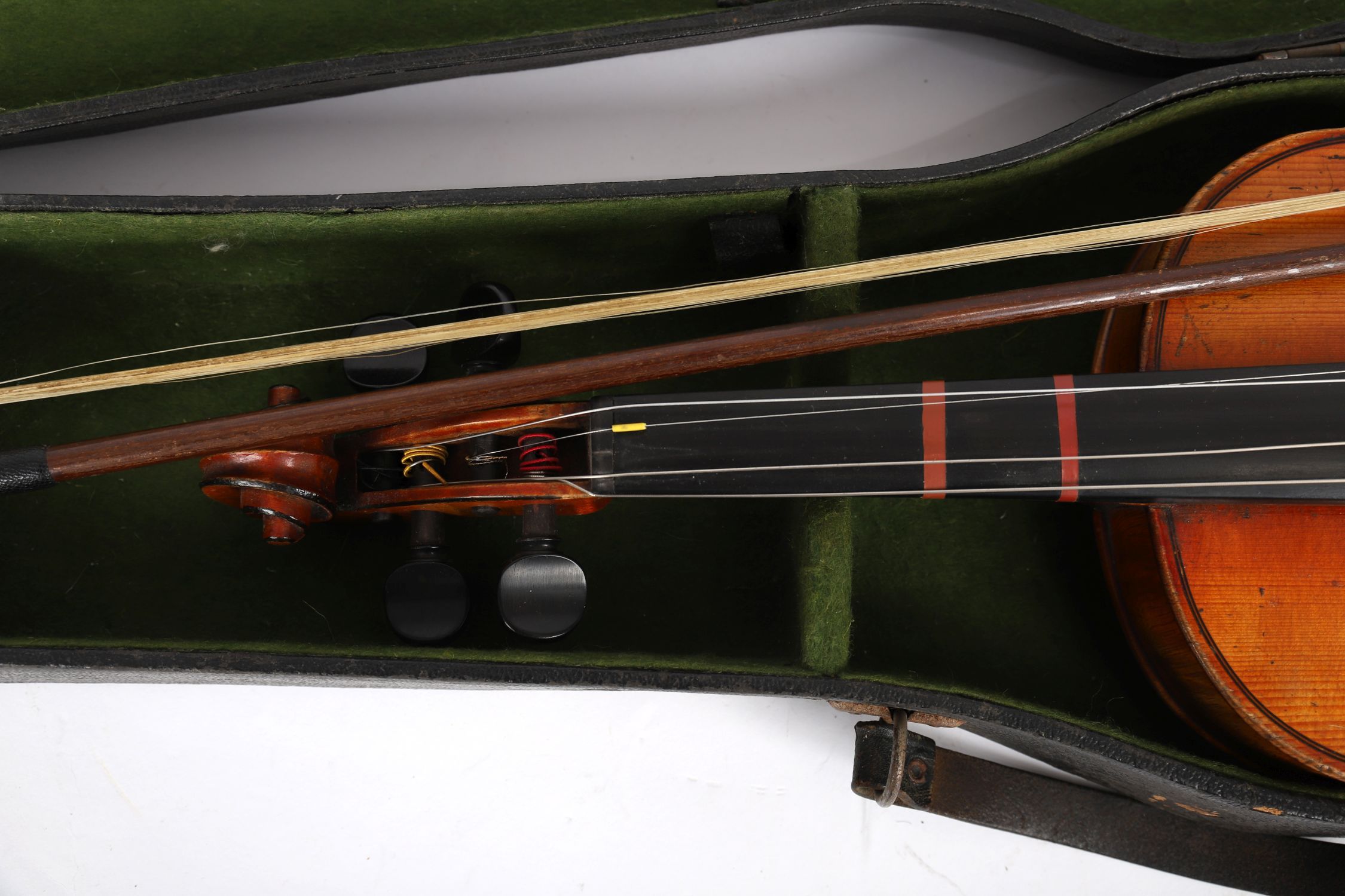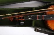 A violin with two-piece back, spruce top, and ebony fittings, accompanied by a bow and housed in an old fitted case lined in green baize. The instrument shows signs of age and use, with wear to varnish and fittings.