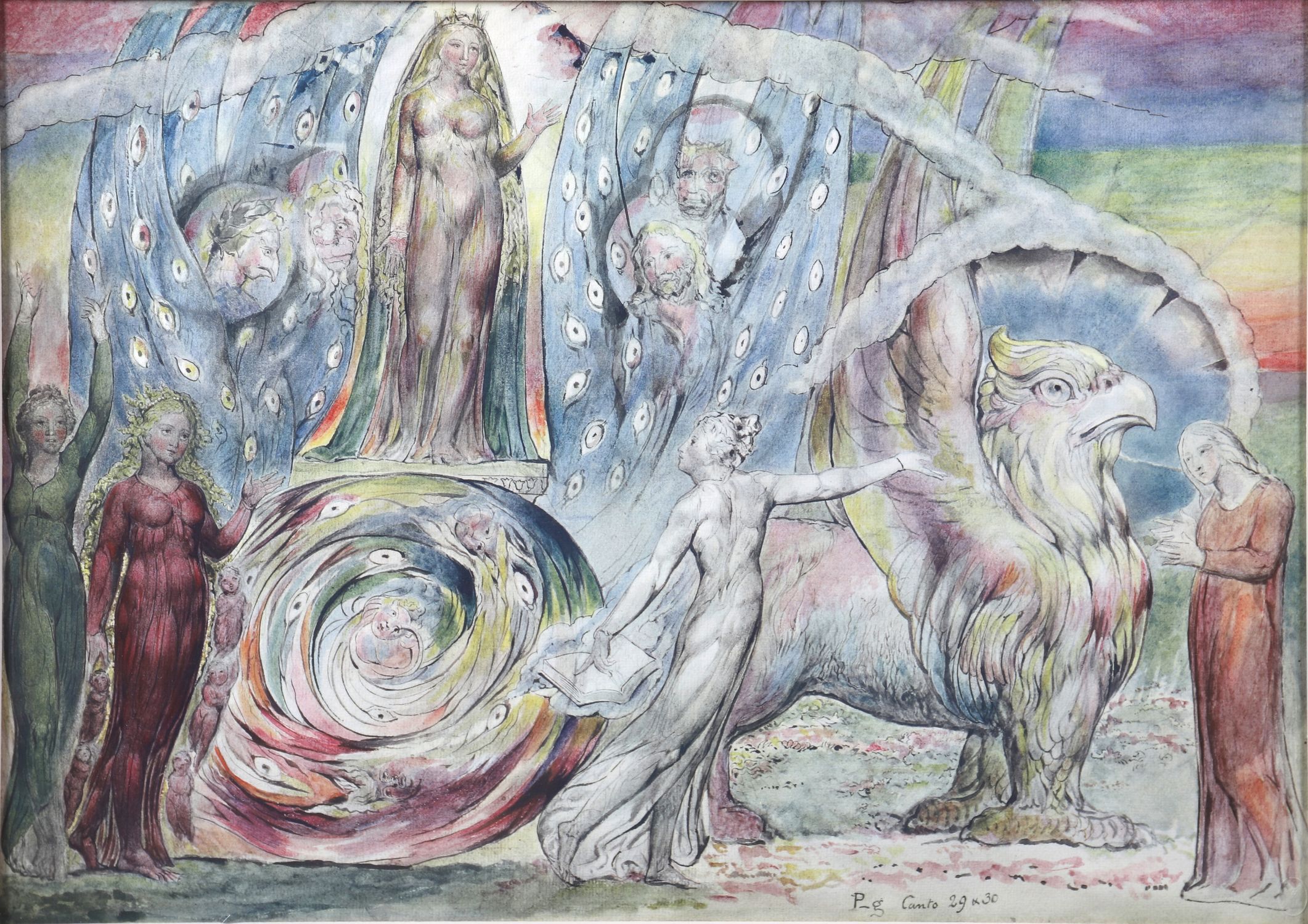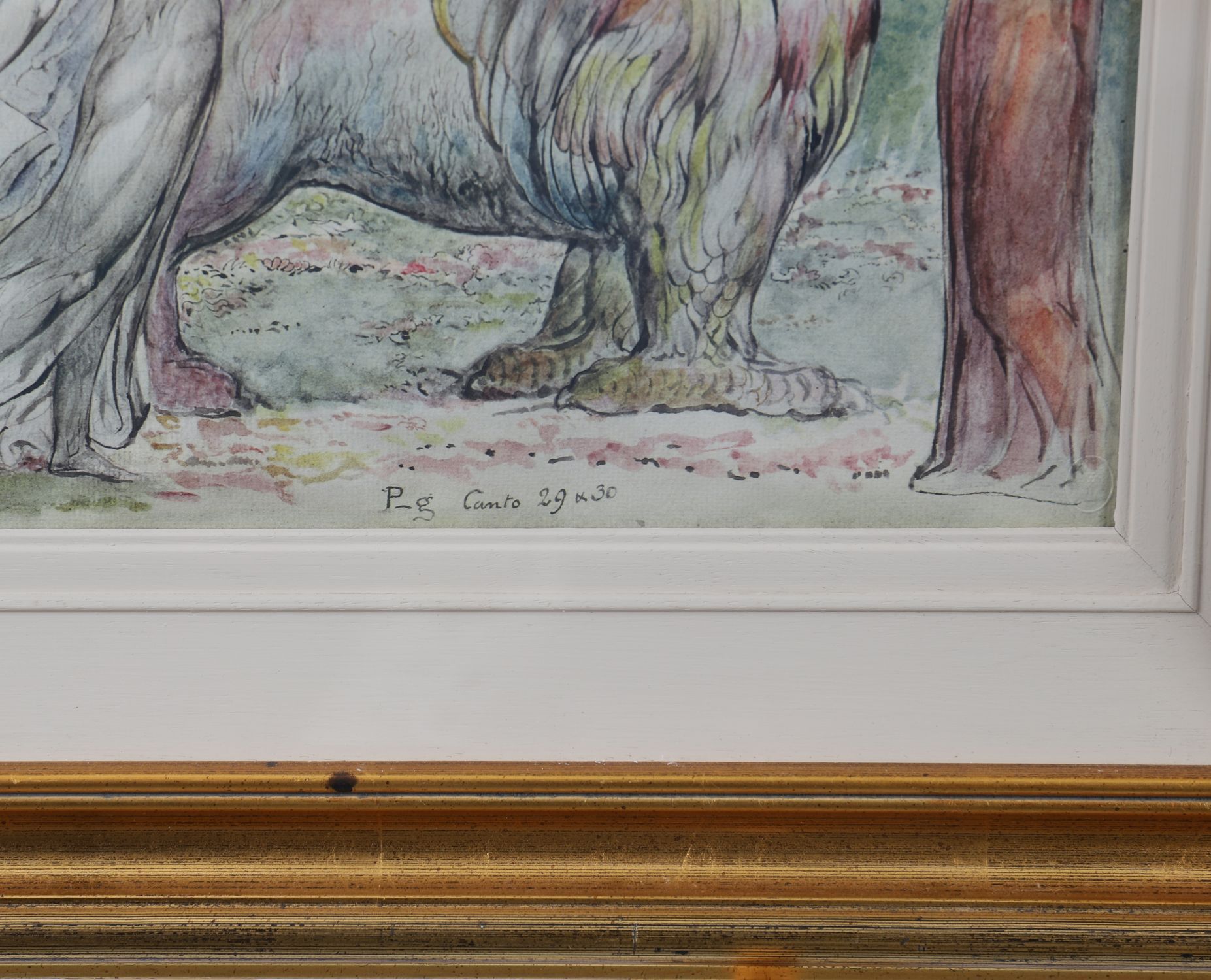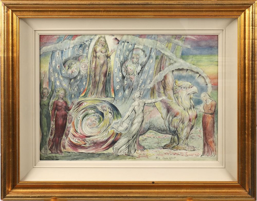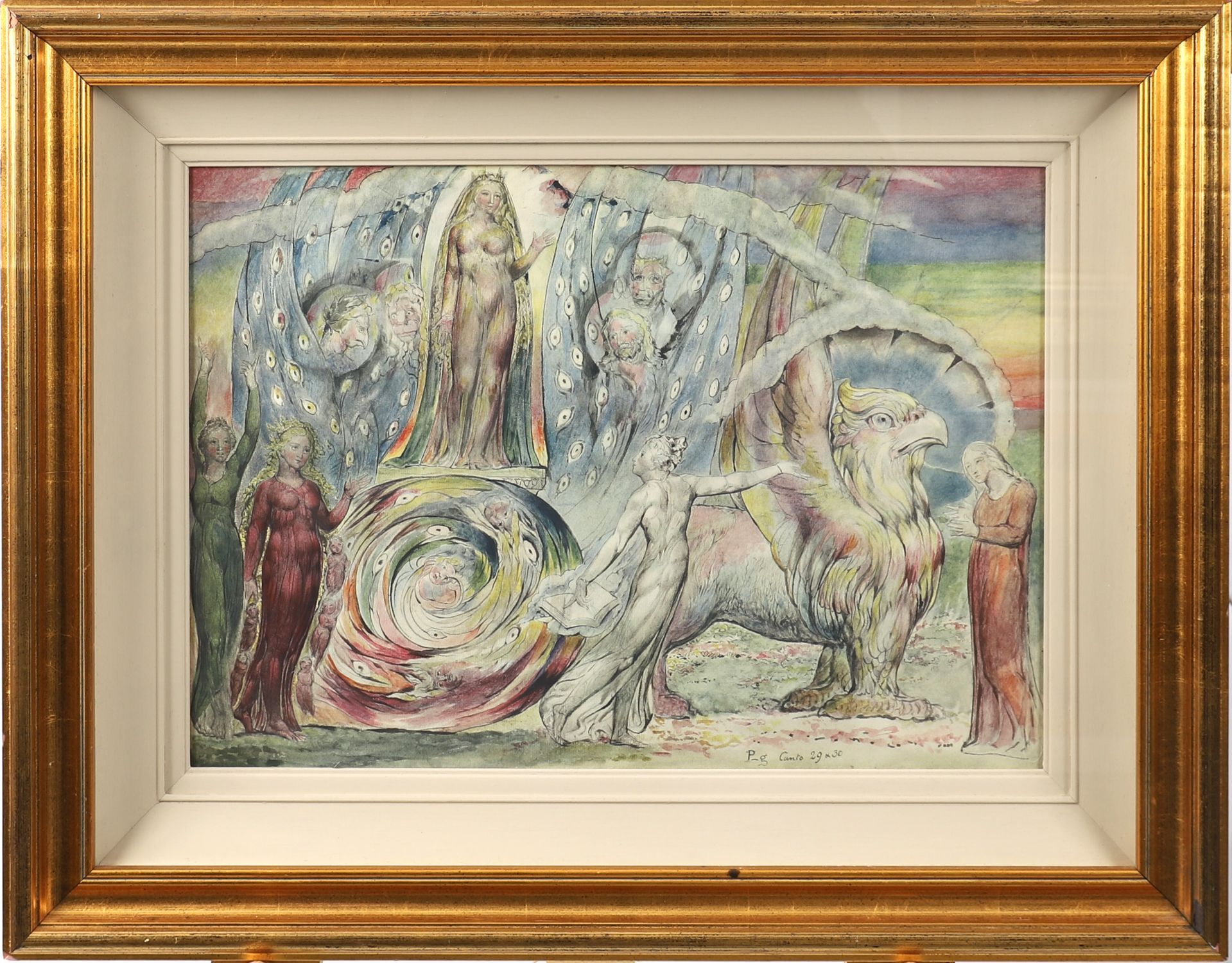 A finely executed allegorical watercolour, titled “P. 9. Canto 29.30”, referencing a passage from Dante Alighieri’s Divine Comedy. The composition is rich with symbolic figures, including a crowned female figure flanked by angels within peacock-feathered wings, a lion-eagle hybrid beast, and robed attendants, all enveloped in swirling celestial forms. The work captures a mystical moment in vivid detail and colour, drawing on Blakean traditions of spiritual illustration. Possibly inspired by William Blake’s visionary interpretations of Dante; inscribed lower centre with reference to Canto XXIX of Paradiso.