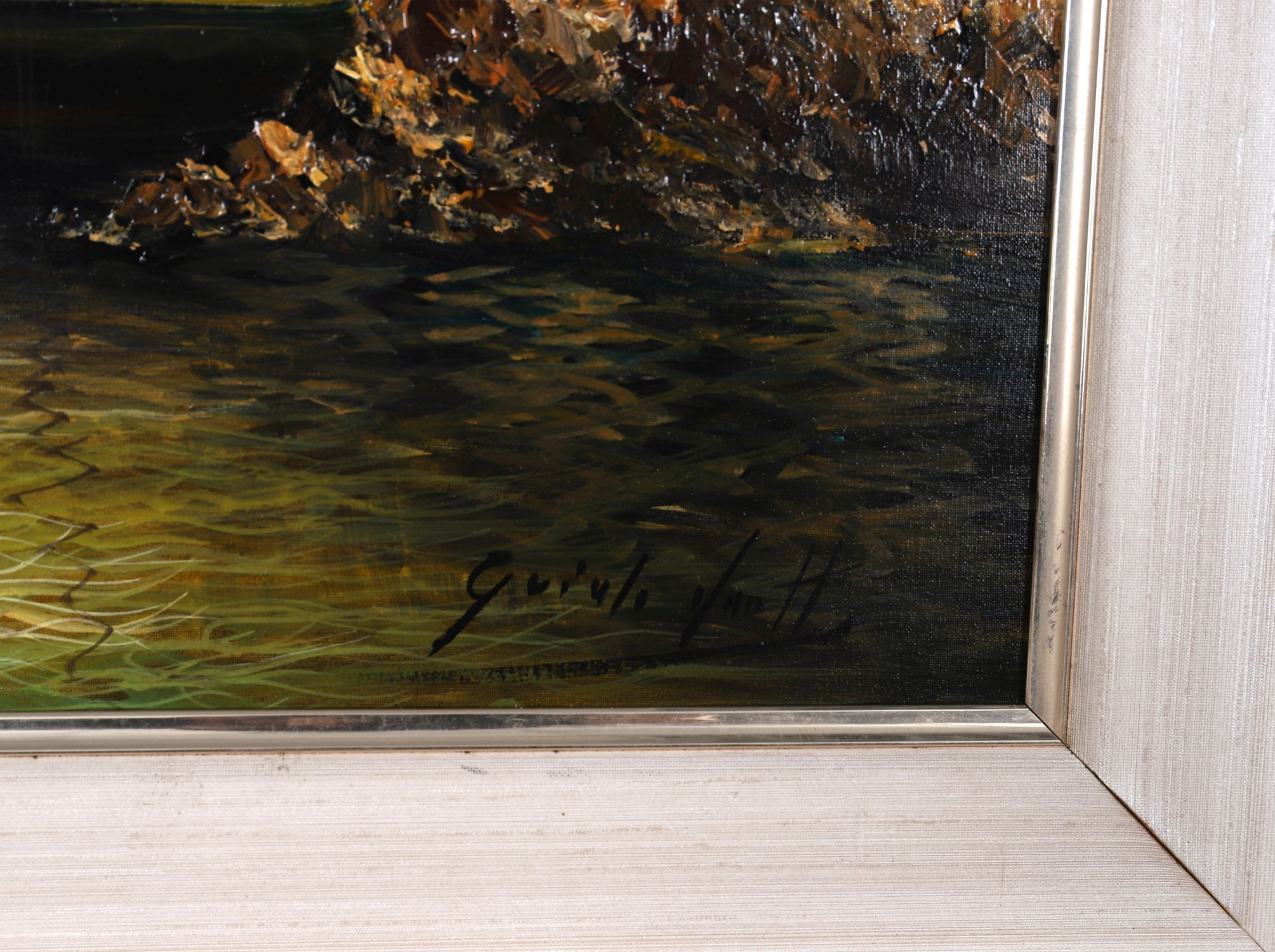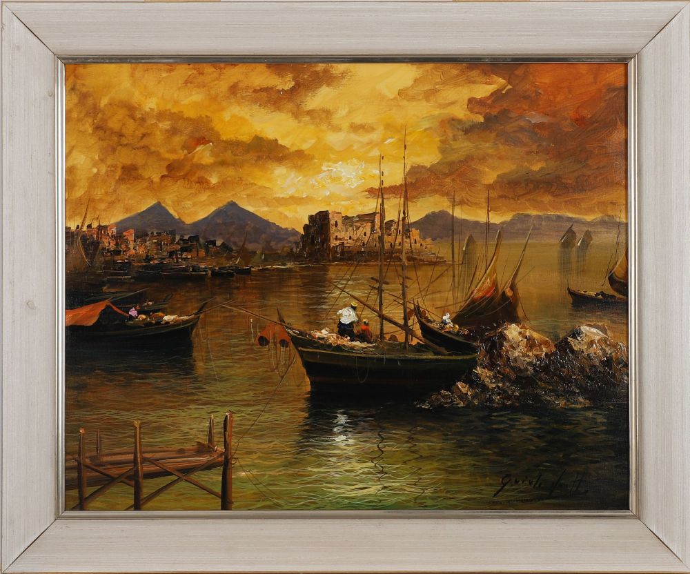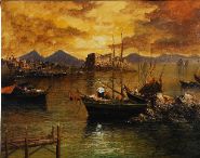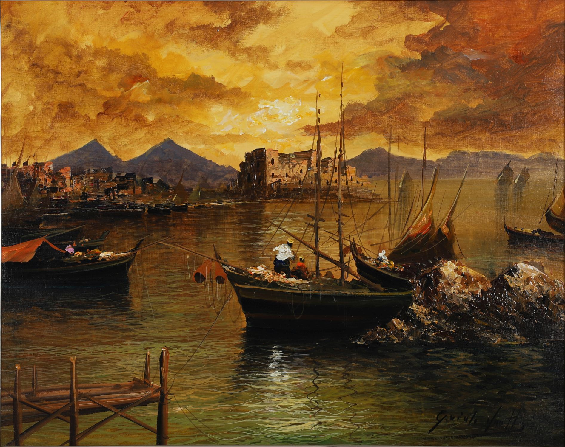 Oil on canvas, depicting fishing boats at dock before the Bay of Naples, Mercellino, with Vesuvius and dramatic golden sky beyond. Framed. Signed oil on canvas.
