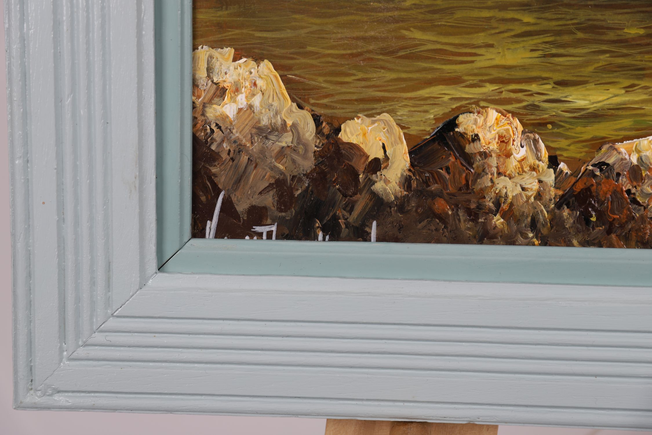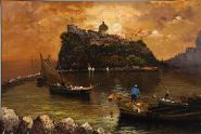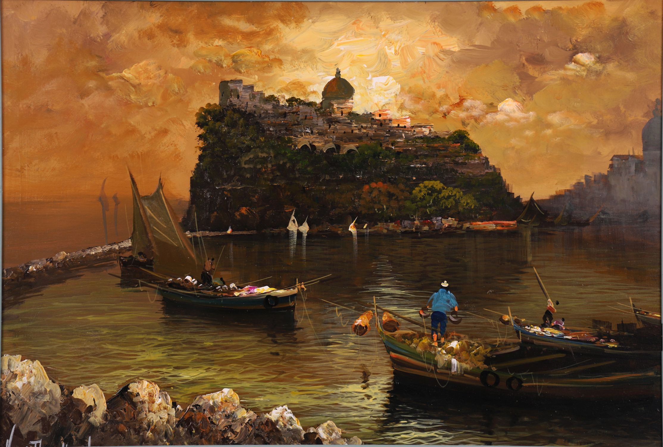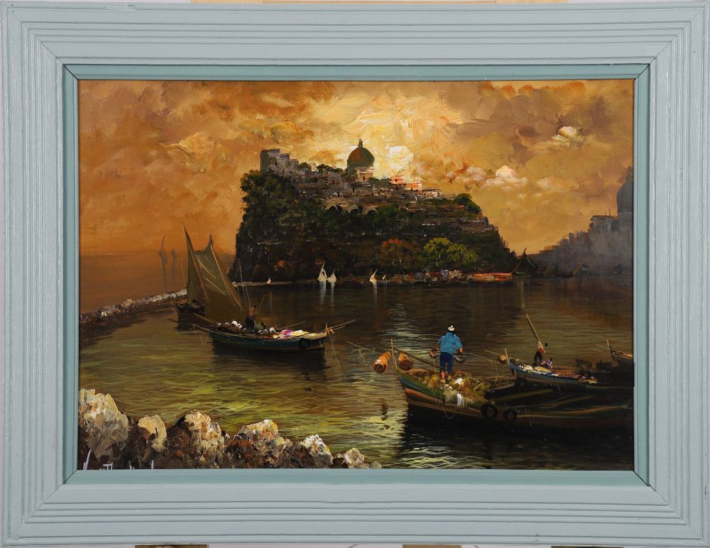 Ischia Al Tramonto. Signed oil on board. Enclosed in a moulded frame.