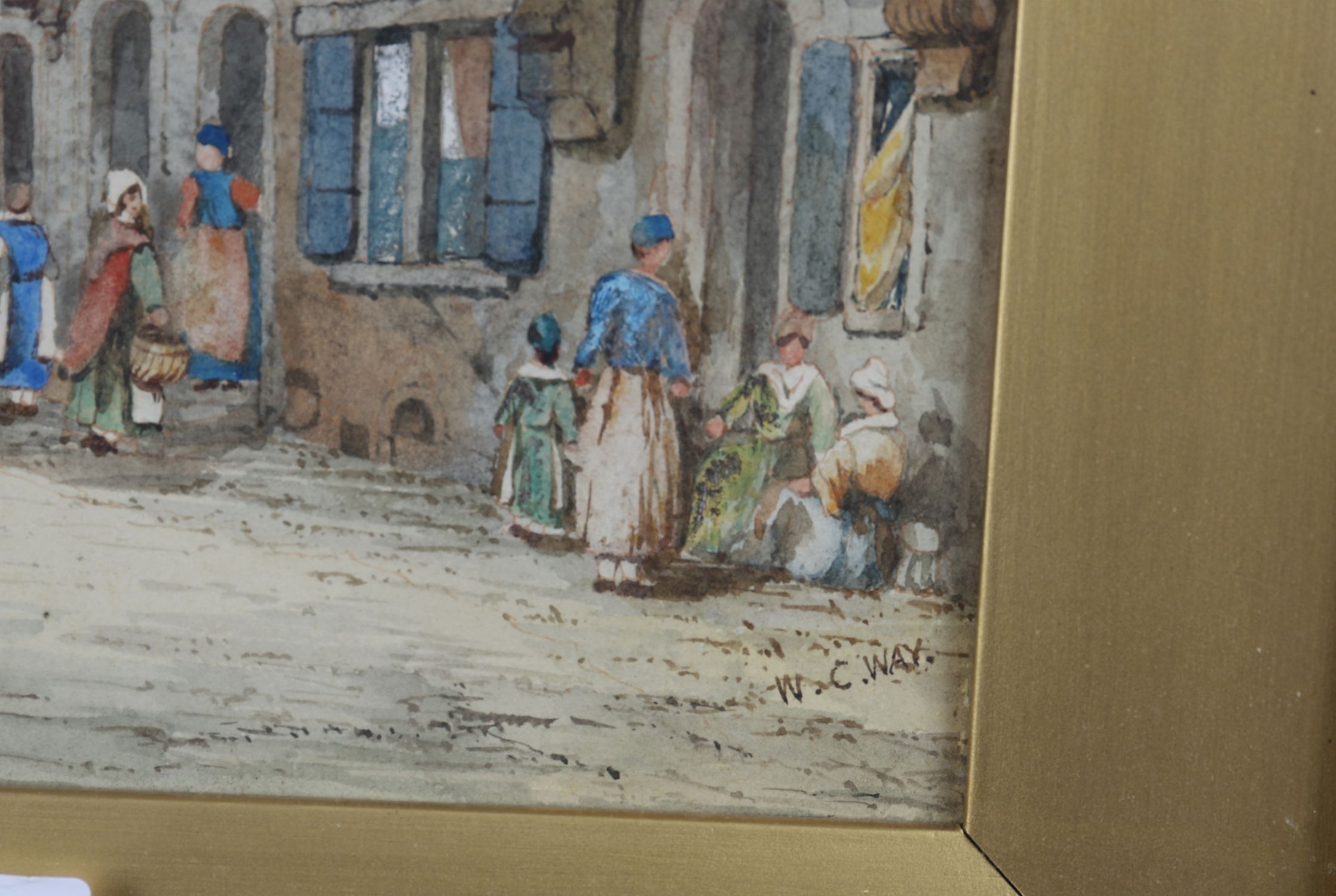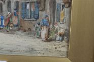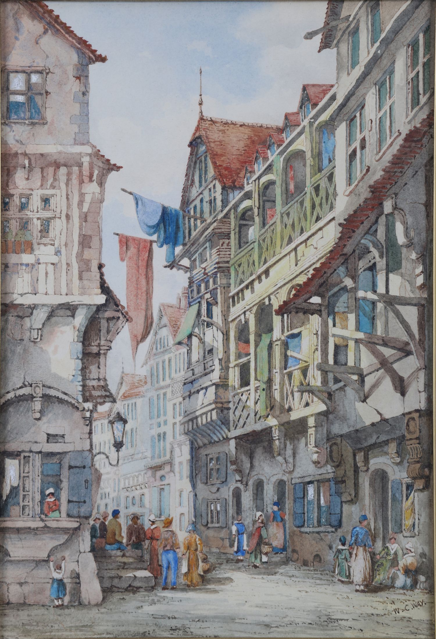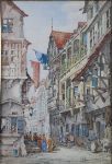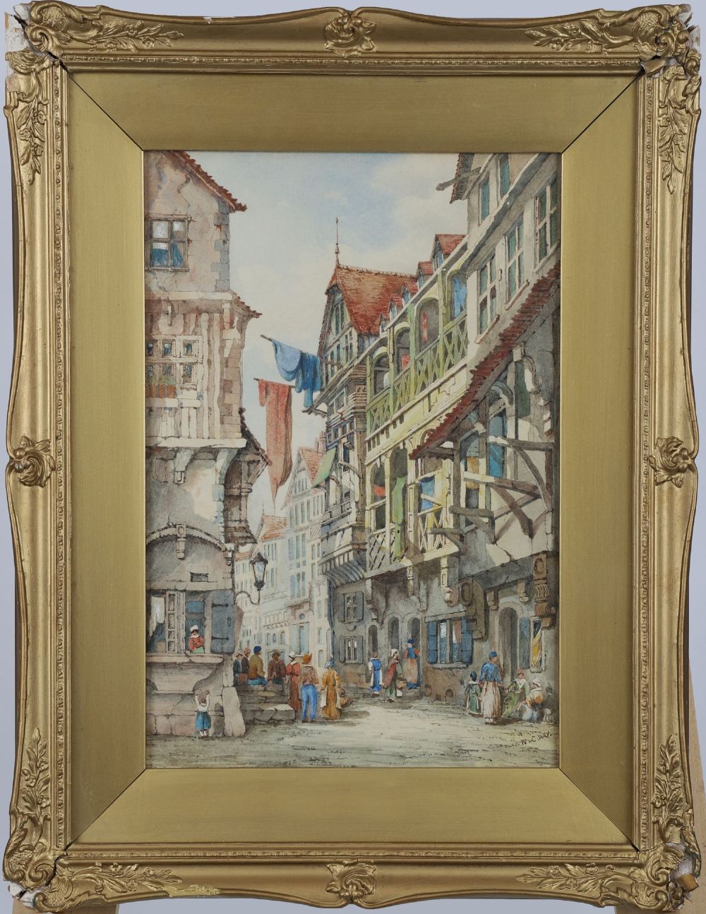 A watercolour of a lively medieval street with half-timbered houses, figures in period dress, and washing hanging from windows. Signed lower right. Presented in gilt frame. Watercolour.