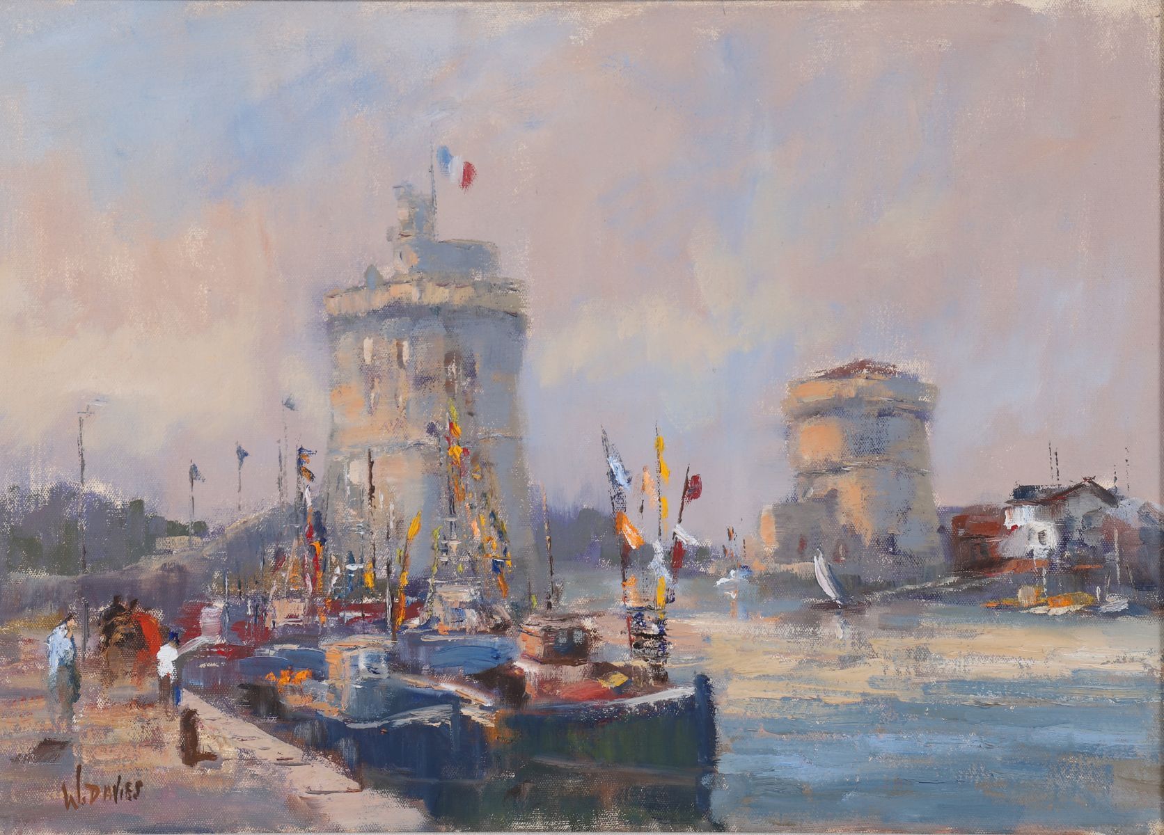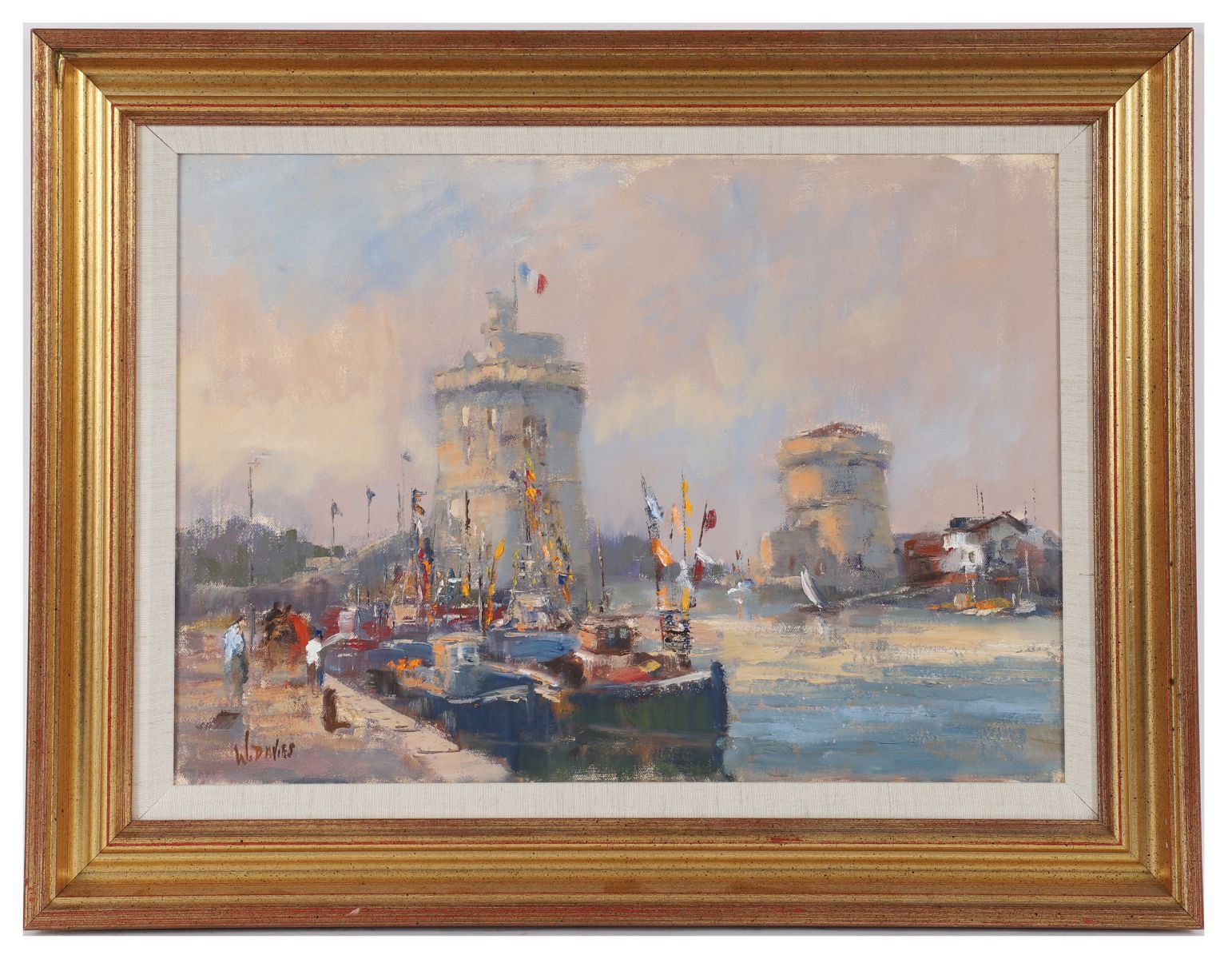 Lot 1349 W. DAVIES, “FIGURES ON A QUAY BESIDE A MOORED SHIP,”