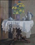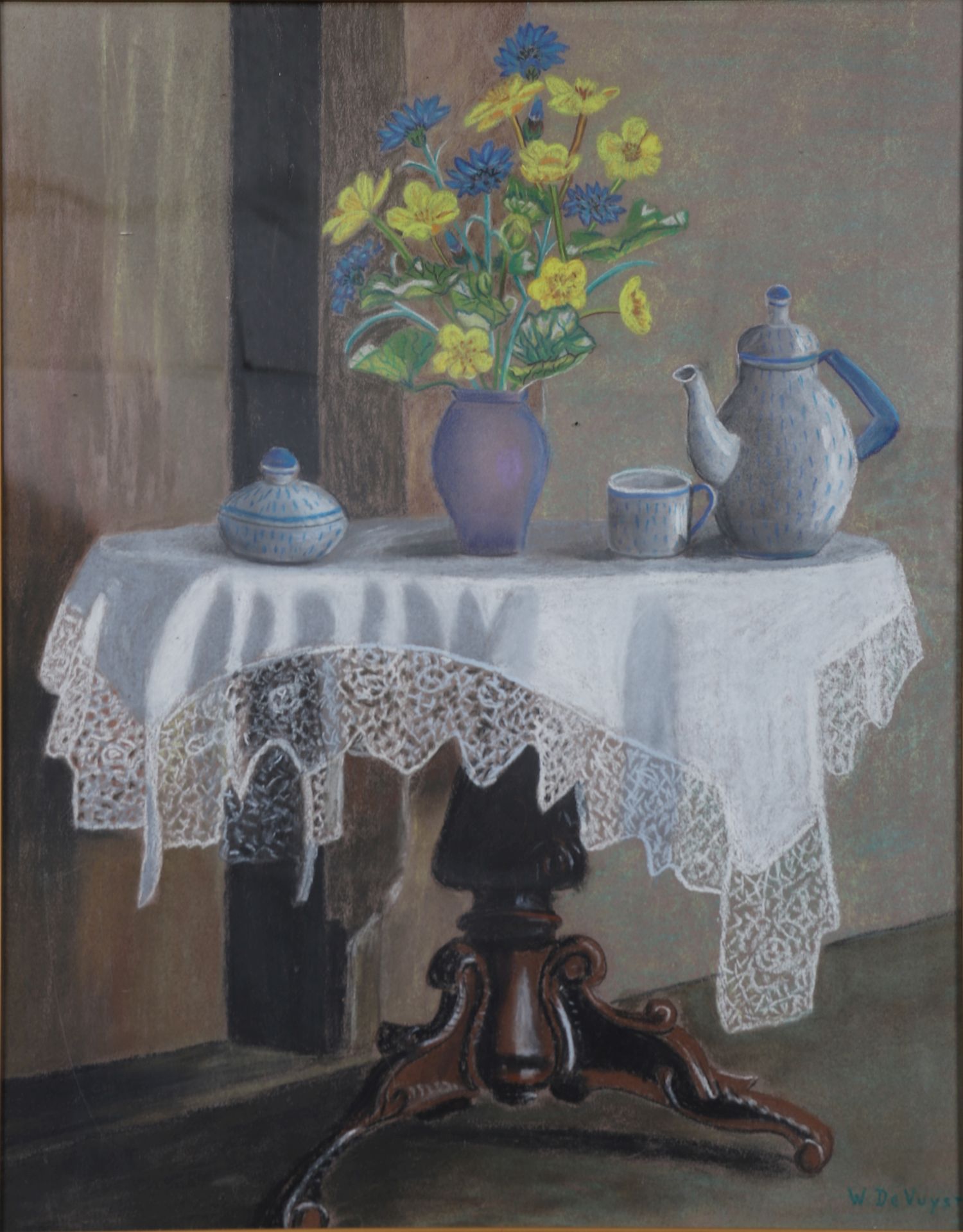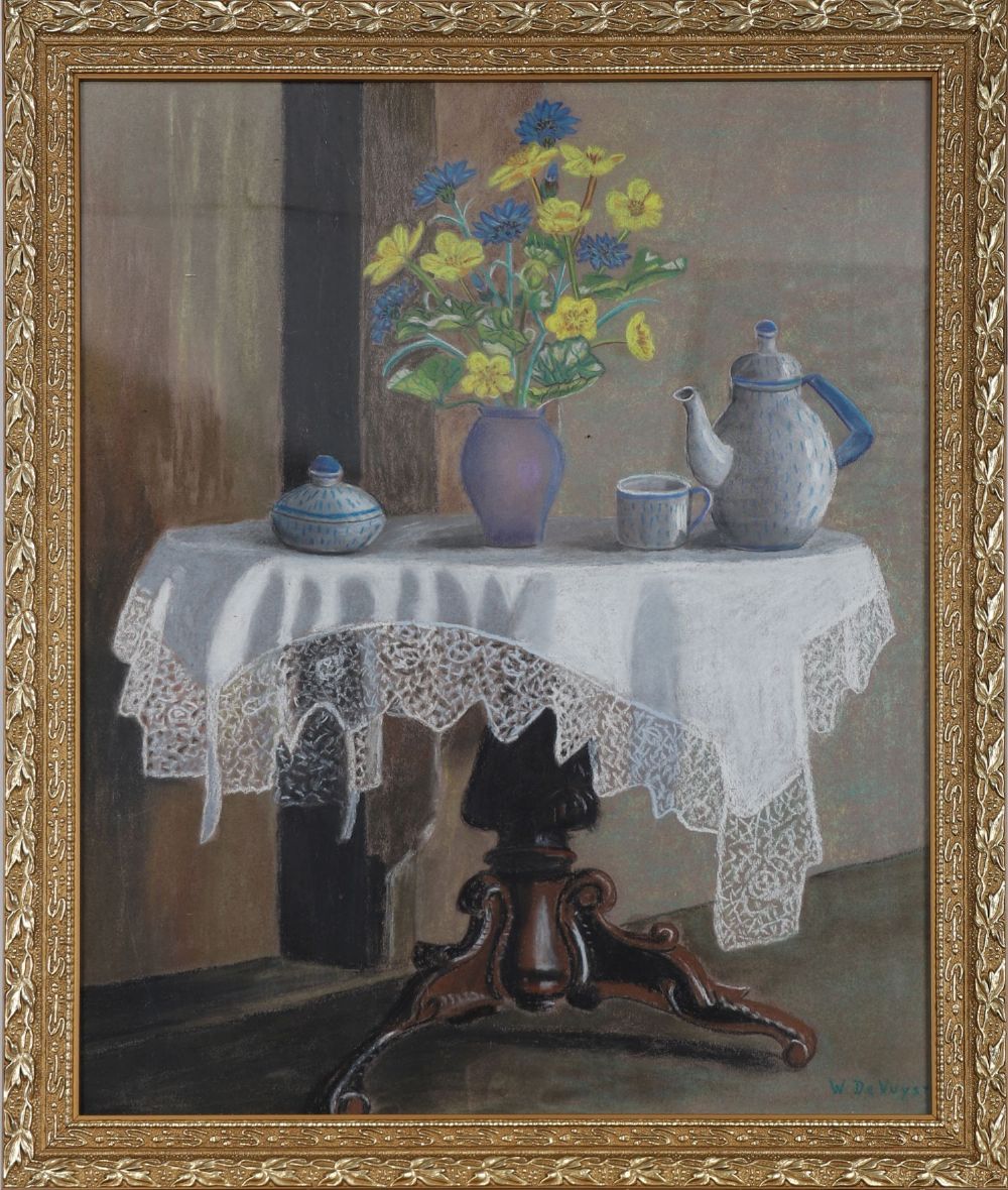 Gouache, depicting a lace-covered table with vase of flowers, teapot, cup, and lidded jar. Signed lower right “W. De Yuystâ€. Enclosed in a gilt frame. Gouache.