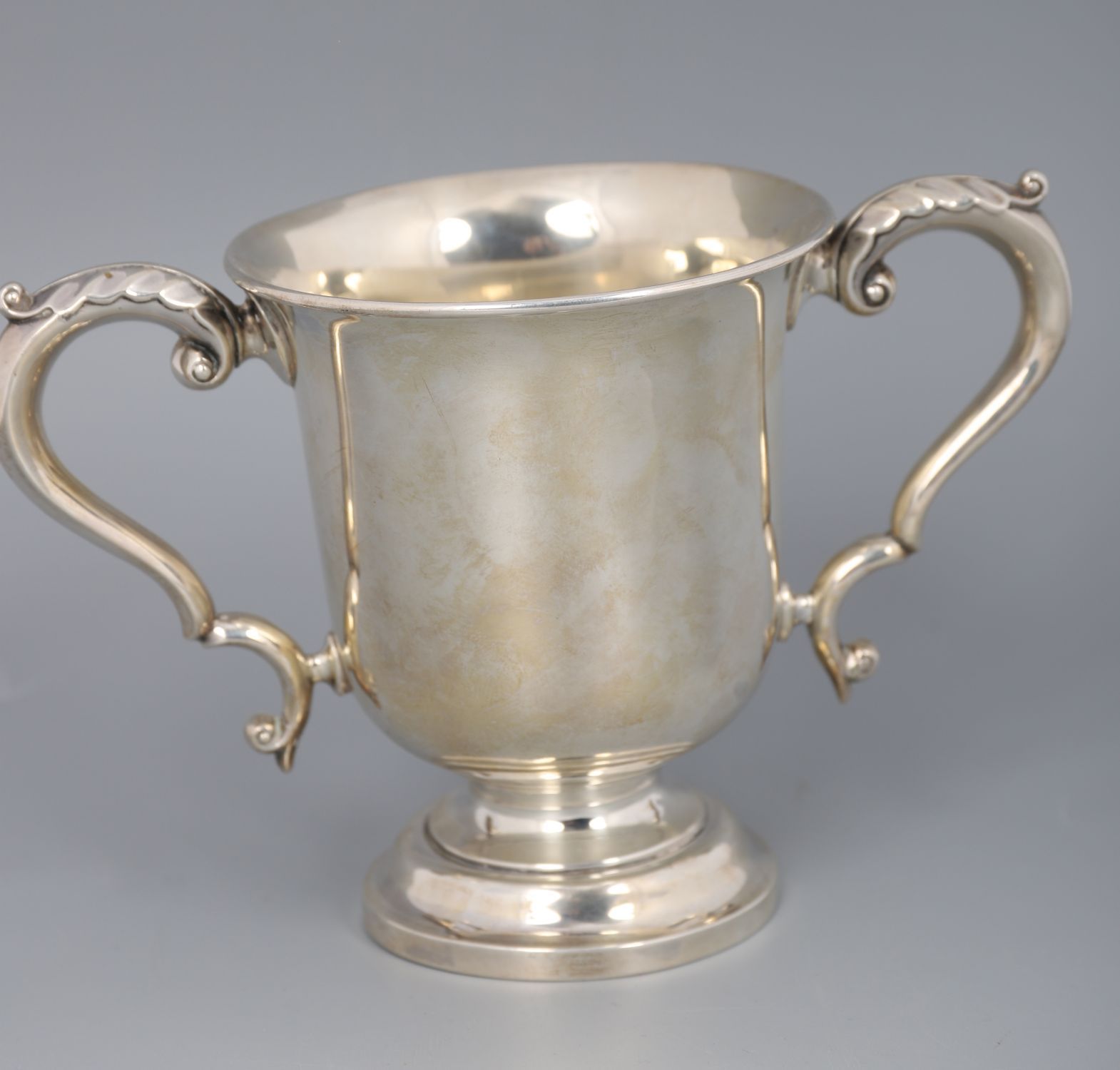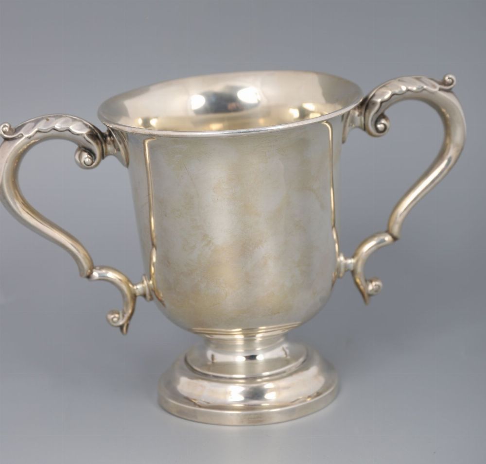 A twin-handled silver loving cup, Sheffield 1912 by Walker & Hall, plain baluster body with scrolled handles, raised on spreading circular foot.