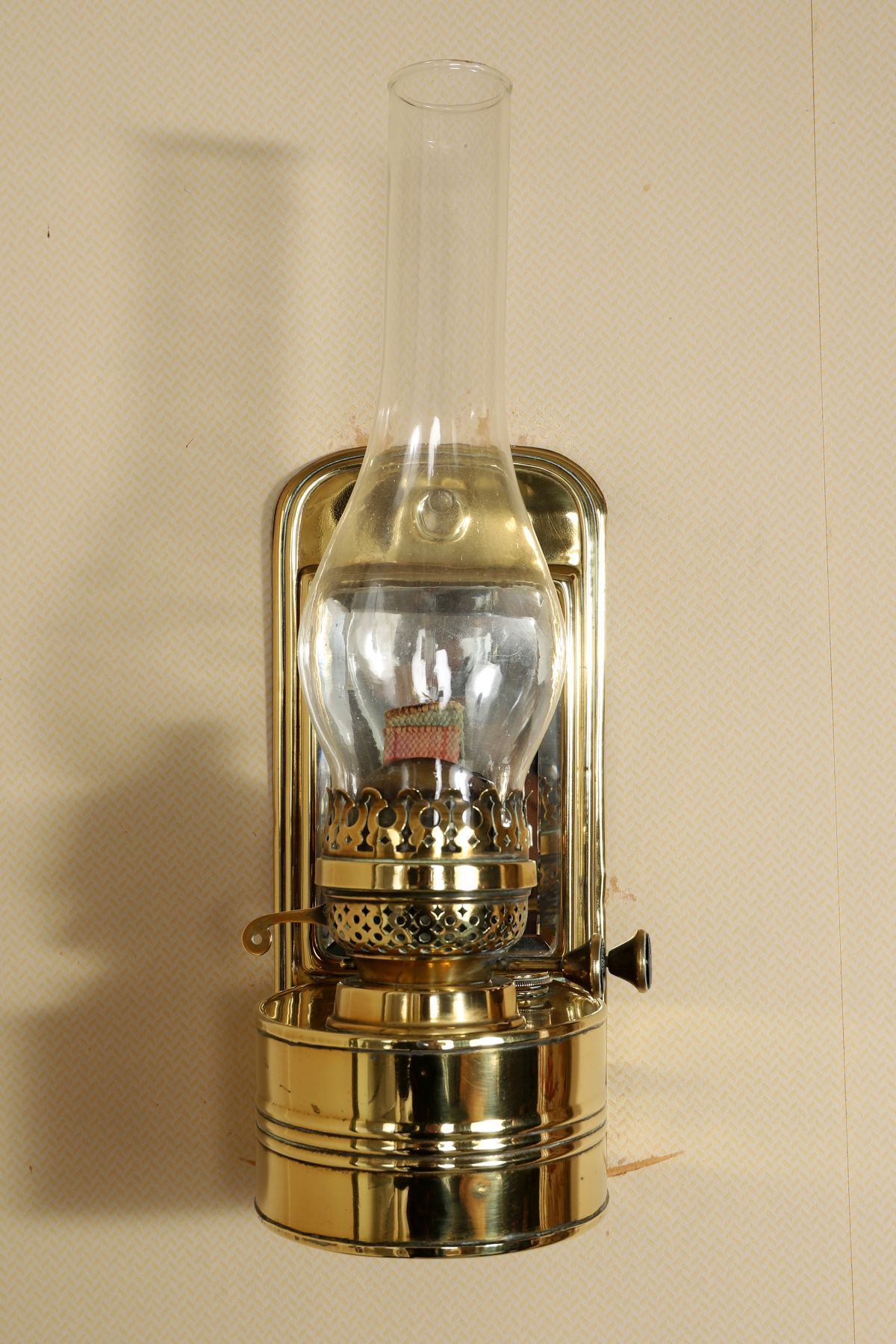 Polished brass wall-mounted oil lamp with adjustable swing arm, fitted with cylindrical reservoir and burner assembly.