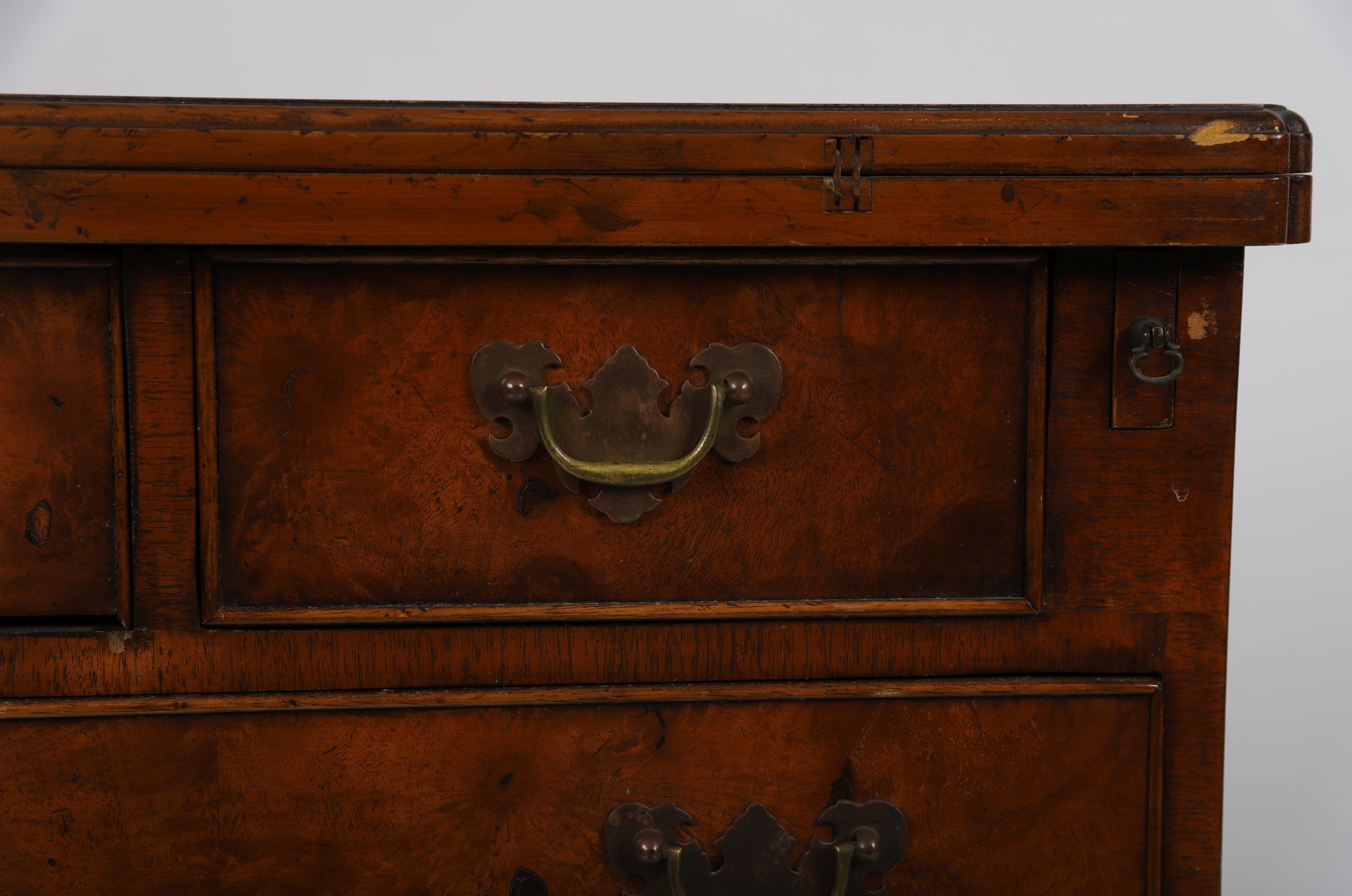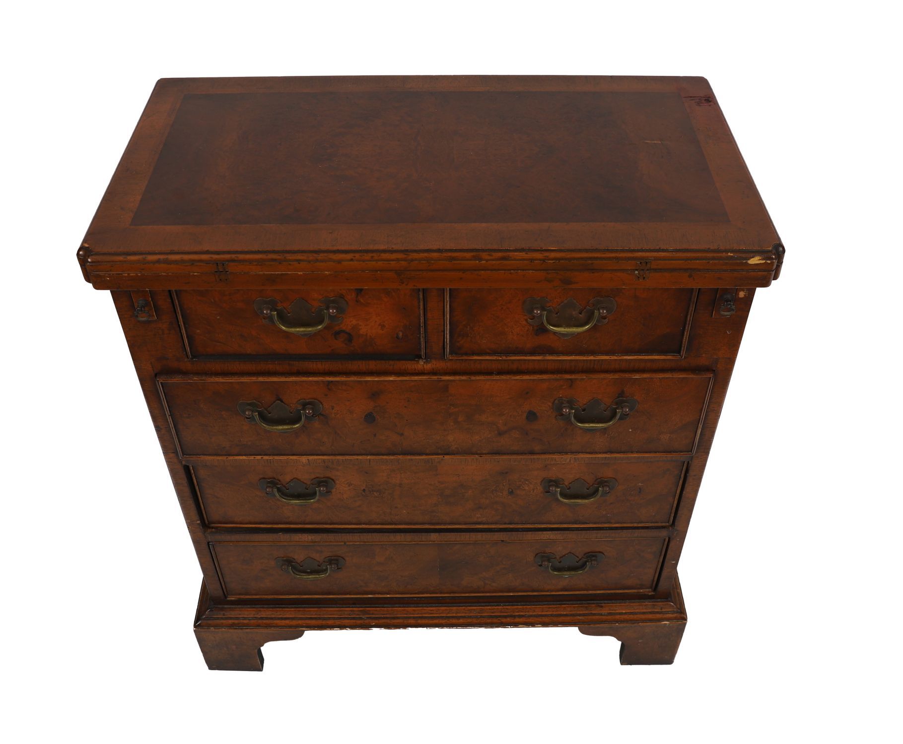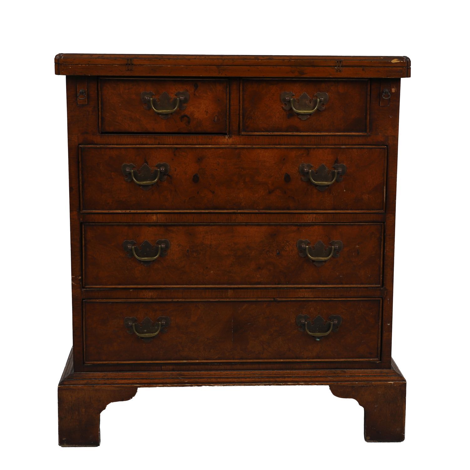 A 20th-century walnut bachelor's chest in the George III manner, the fold-over top above four graduated drawers with brass swan-neck handles, raised on bracket feet. The veneers showing attractive figured grain.