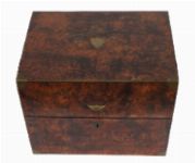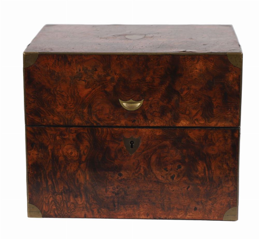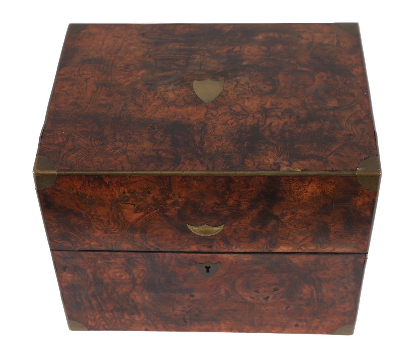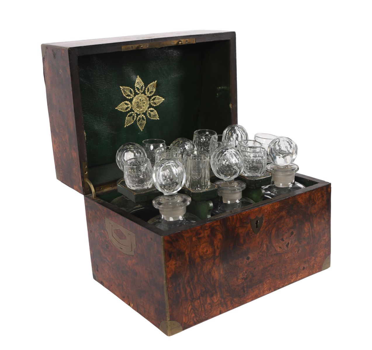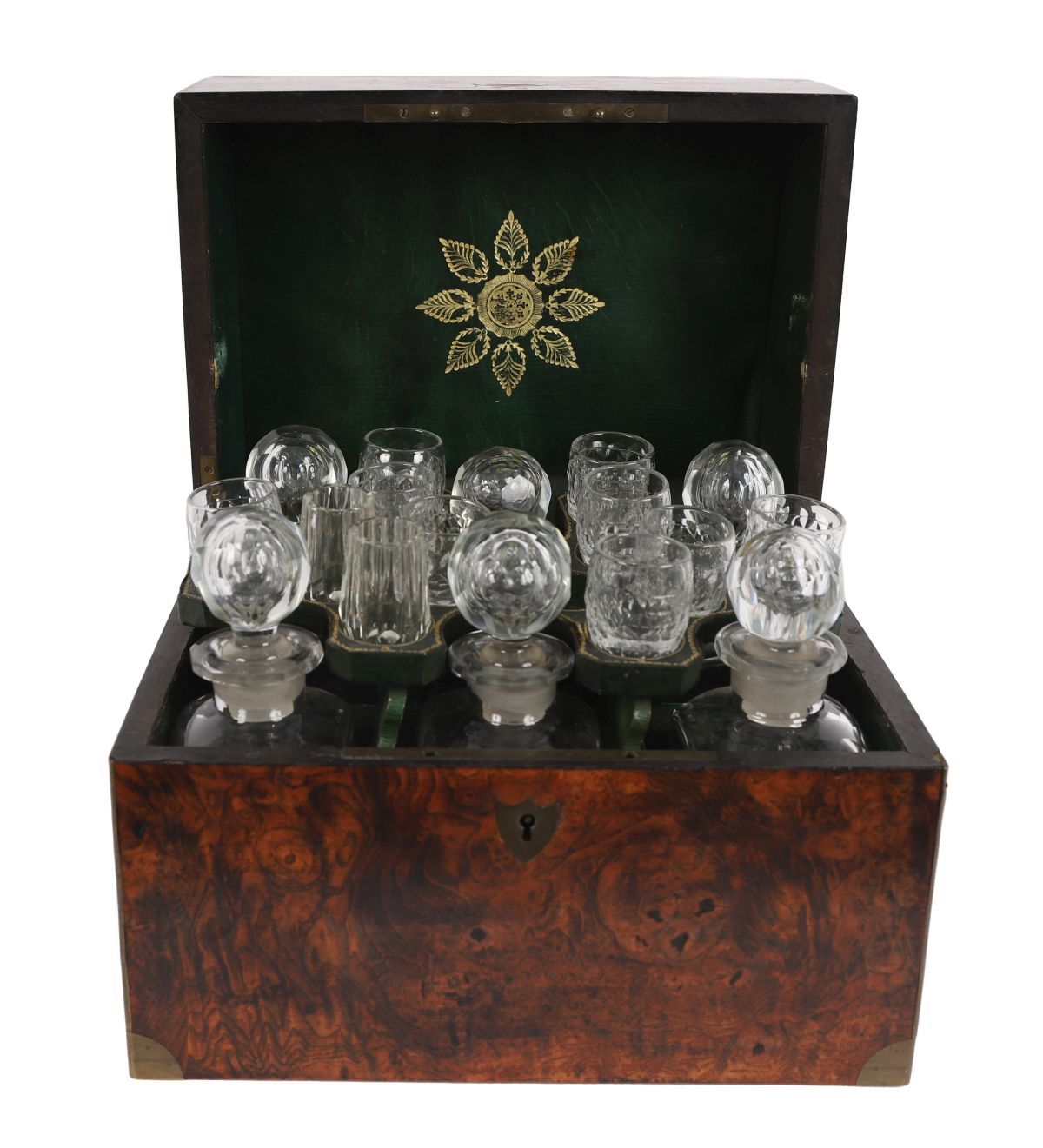 A walnut-veneered liqueur box, the hinged lid opening to a fitted interior containing a set of glass decanters and matching drinking glasses, with inlaid decoration to the interior lid and brass fittings. Late 19th / early 20th century.