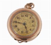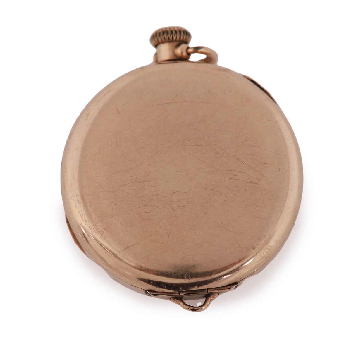 A small circular gold pocket watch with cream dial, Arabic numerals and subsidiary seconds dial, the case with engraved decoration to reverse. Pendant loop and crown suspension.