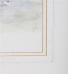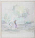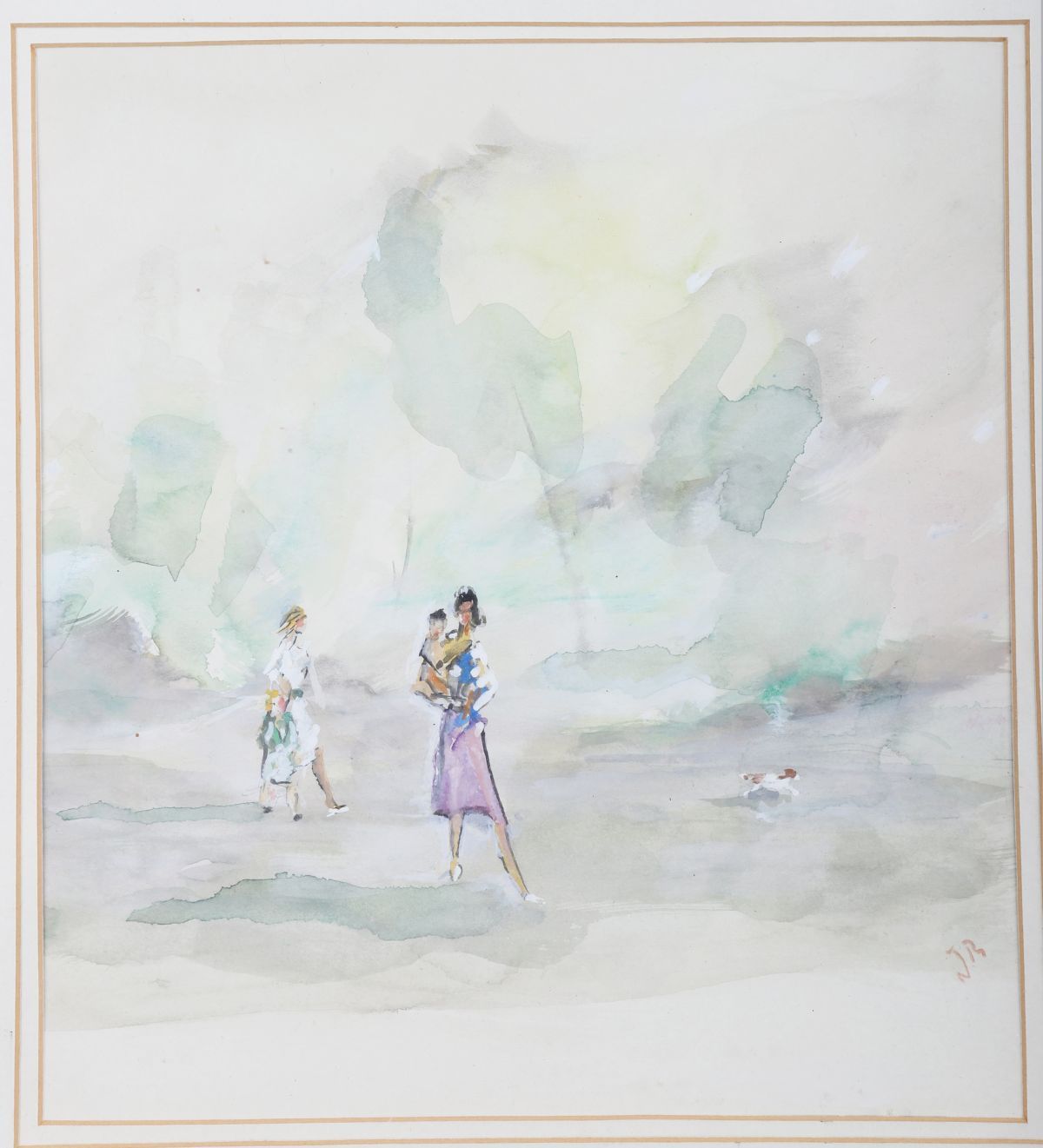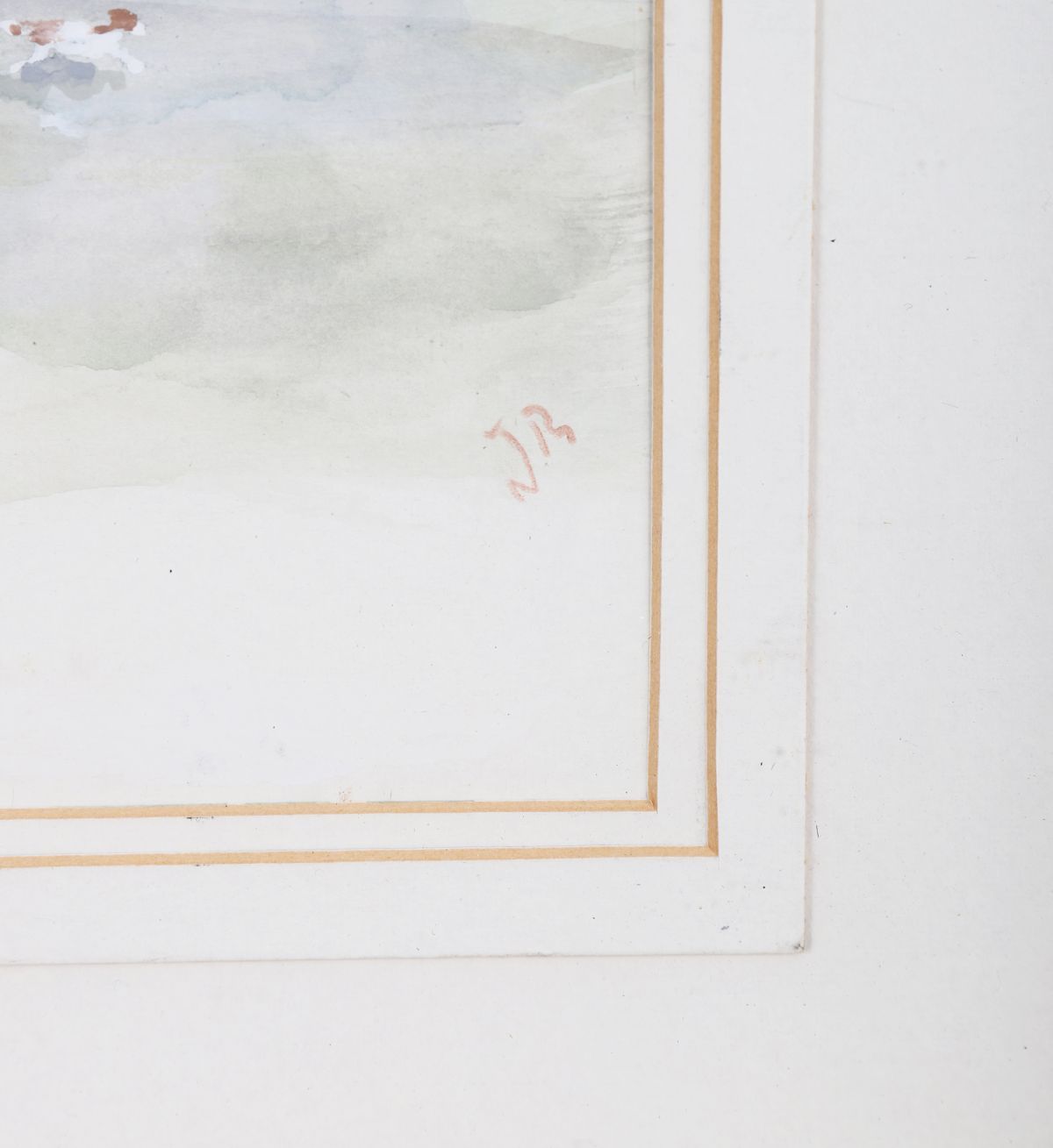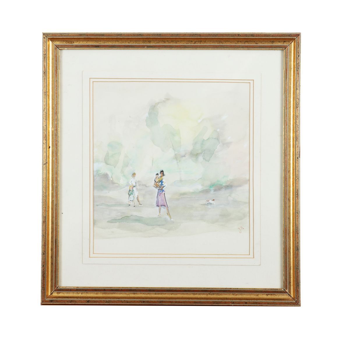 A delicate watercolour depicting three figures walking in a sunlit parkland setting with a small dog in the foreground. Soft washes of green and yellow convey a tranquil atmosphere. Signed with the artist’s initials “J.R.” lower right. Presented in a gilt frame with double mount.