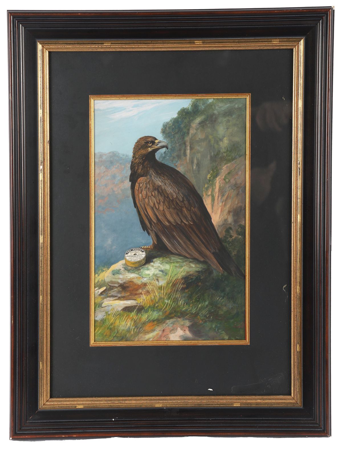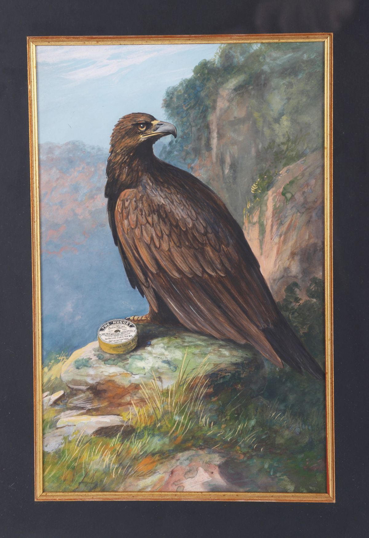 A finely executed watercolour depicting a golden eagle perched upon a rocky outcrop, a tin of ‘The Nugget’ black polish positioned prominently in the foreground. The composition combines naturalistic bird study with commercial branding, executed with careful attention to plumage and landscape detail.