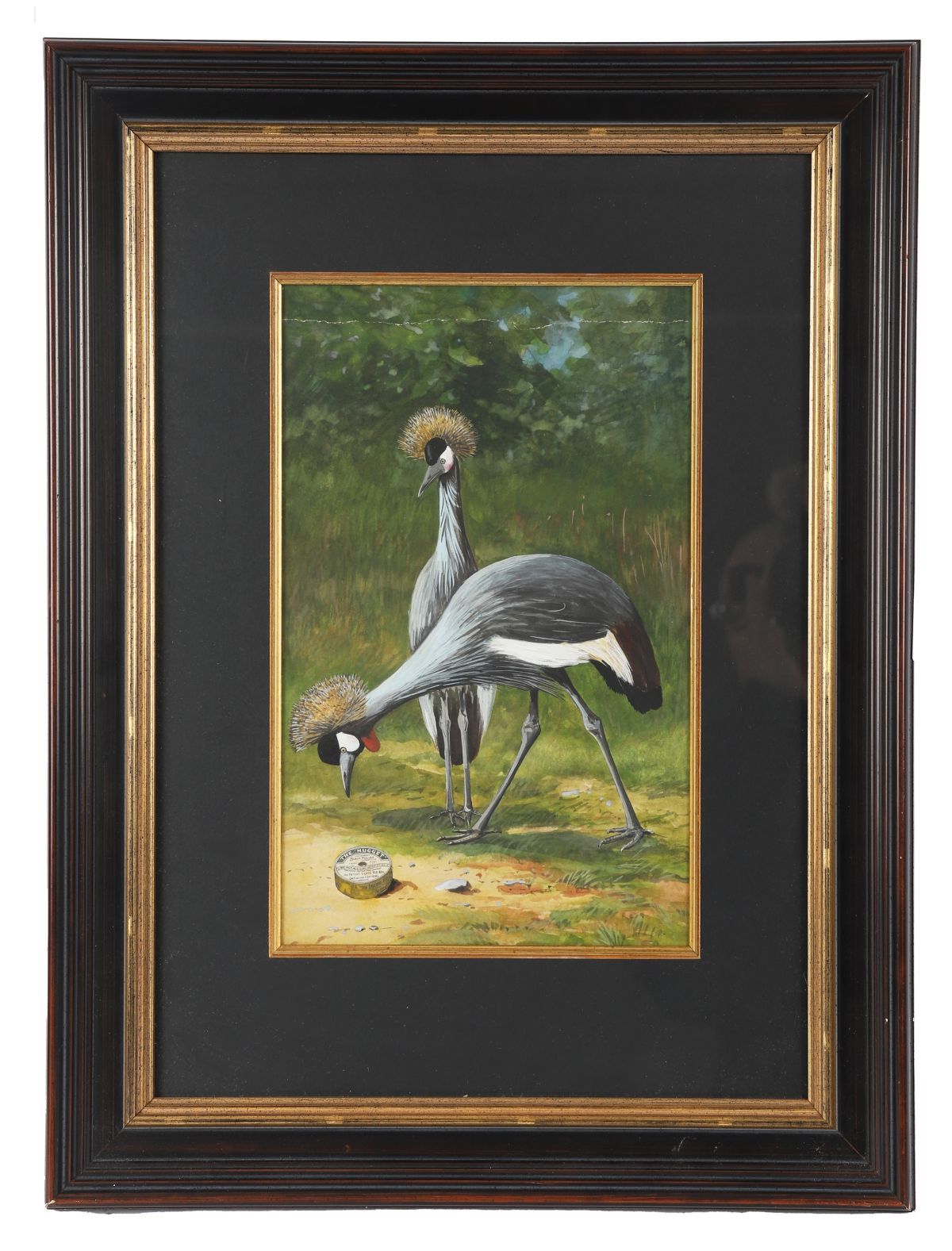 A detailed study of two crowned cranes set against lush foliage, with a tin of ‘The Nugget’ polish placed within the foreground of the composition. The birds rendered with fine plumage detailing and vibrant colour contrasts.