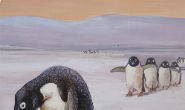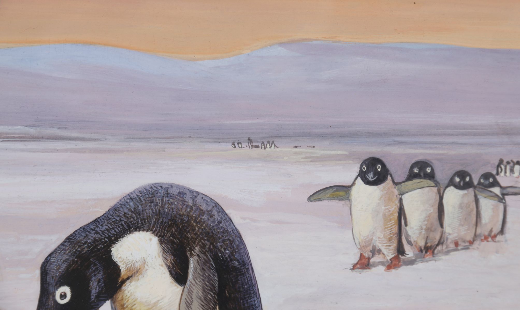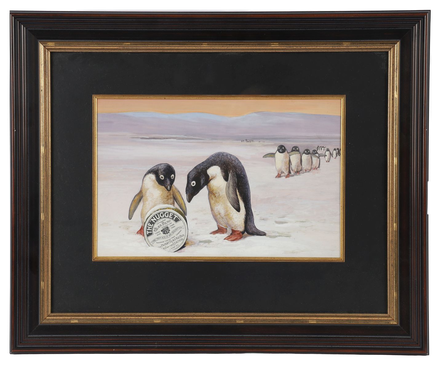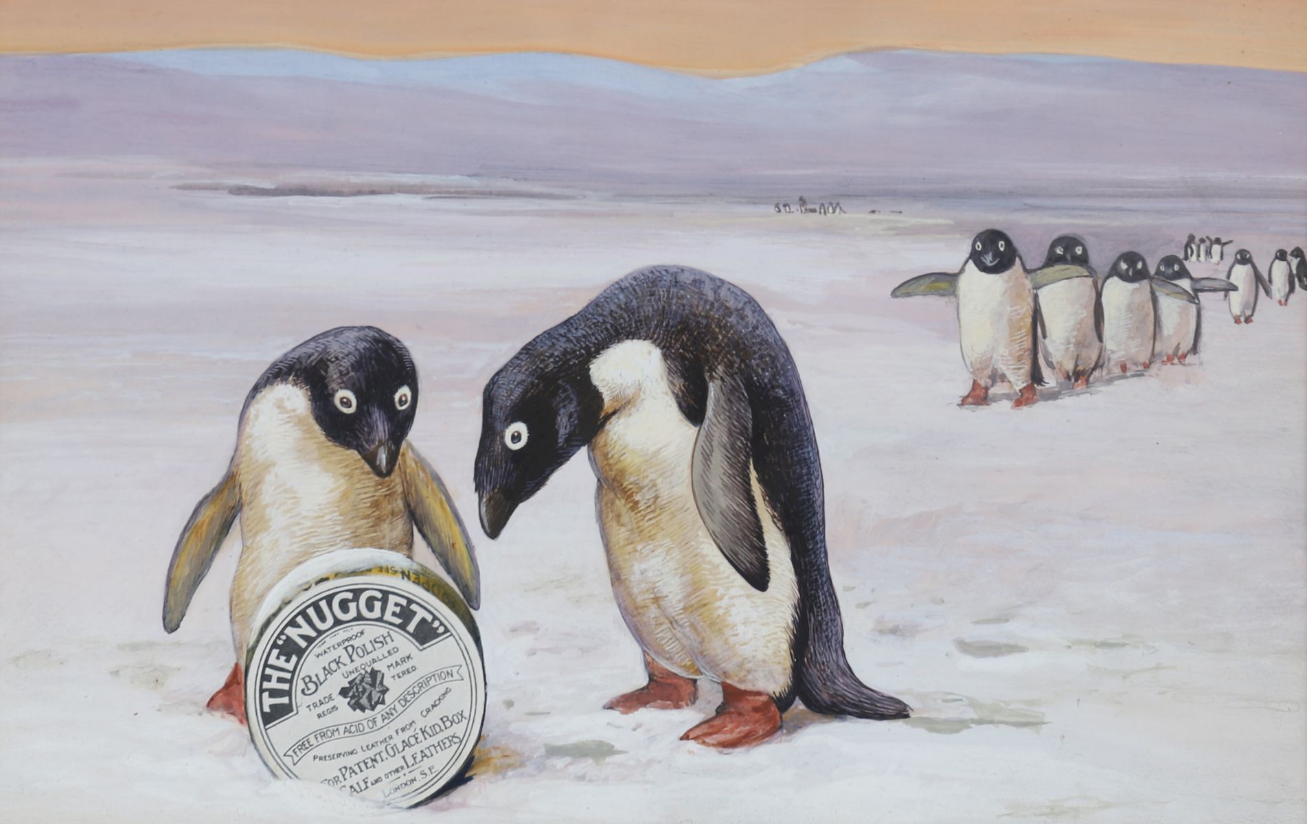 A charming watercolour depicting two penguins examining a tin of ‘The Nugget’ polish, with further figures in the background across a snowy landscape. Executed with humorous narrative intent, combining wildlife illustration with commercial placement.