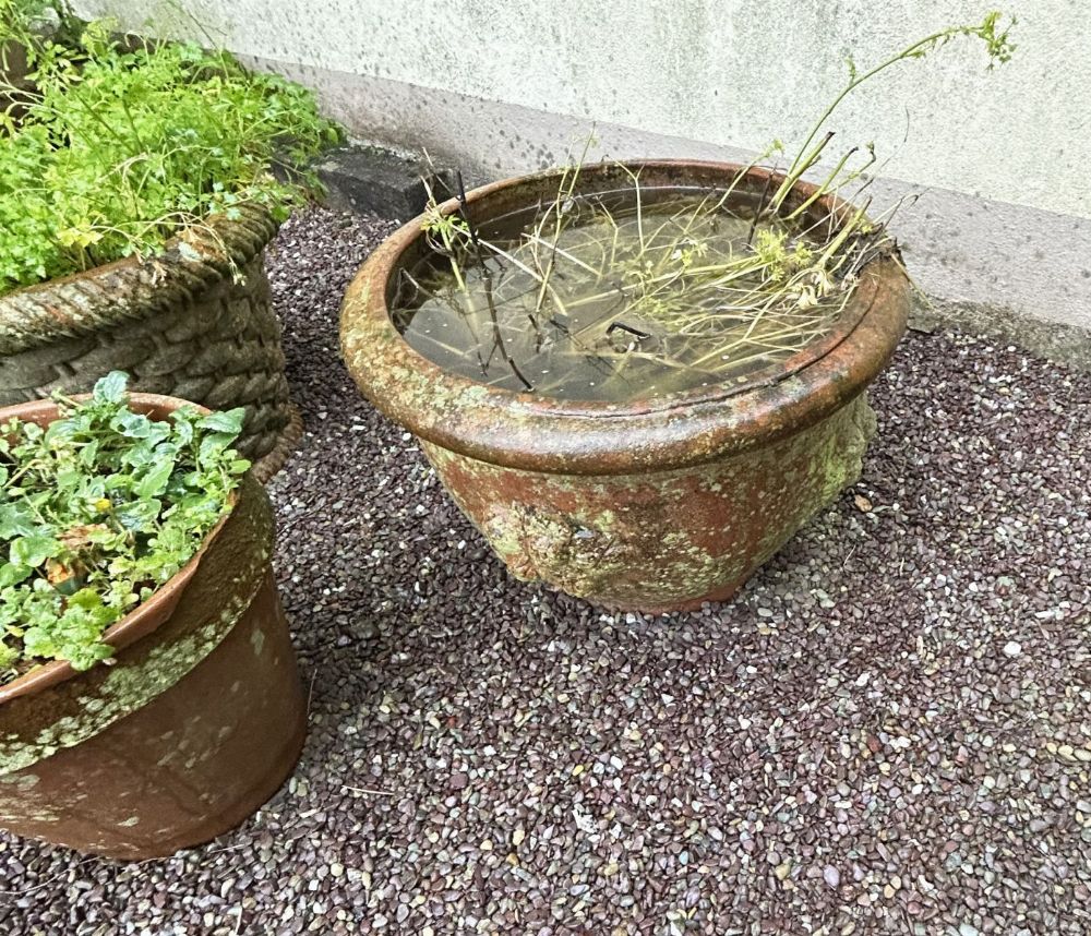 A terracotta jardiniere of circular form with rolled rim, showing natural weathering and planted contents.