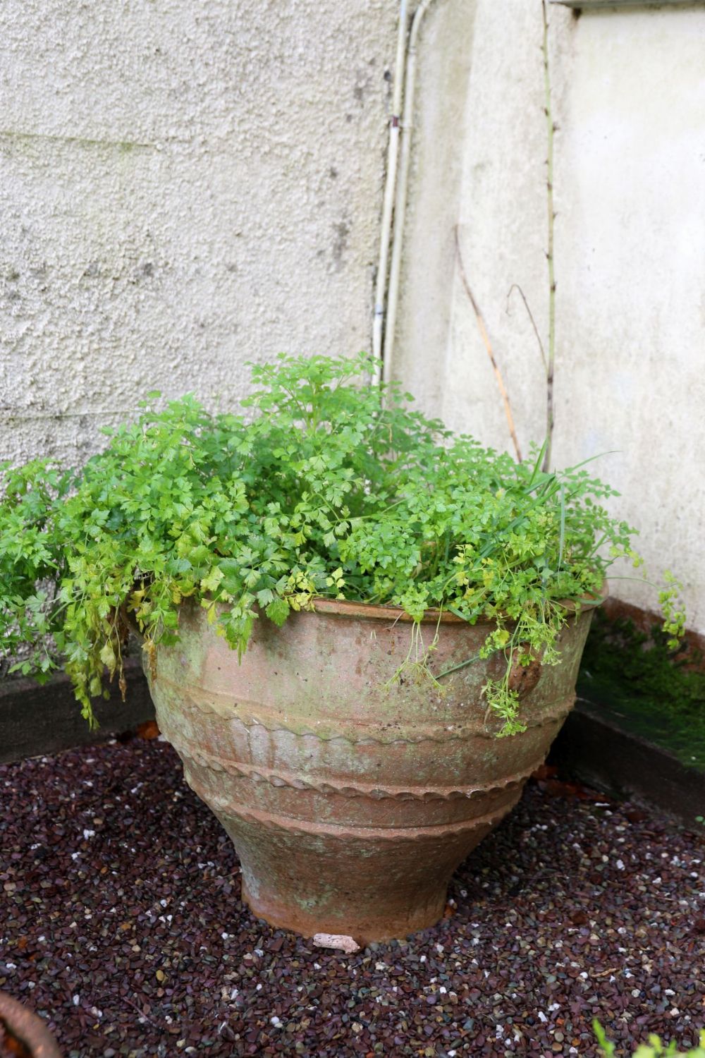 A large terracotta plant pot with natural weathering and planted contents.