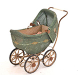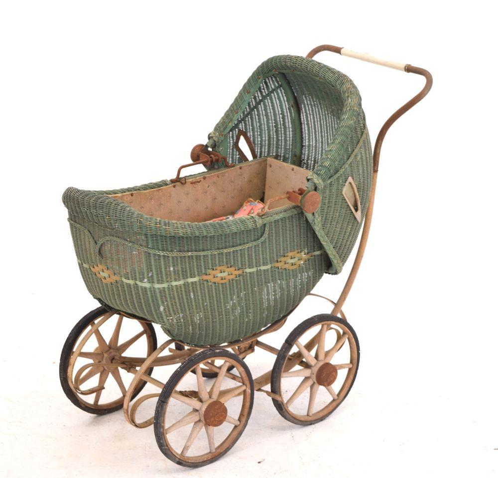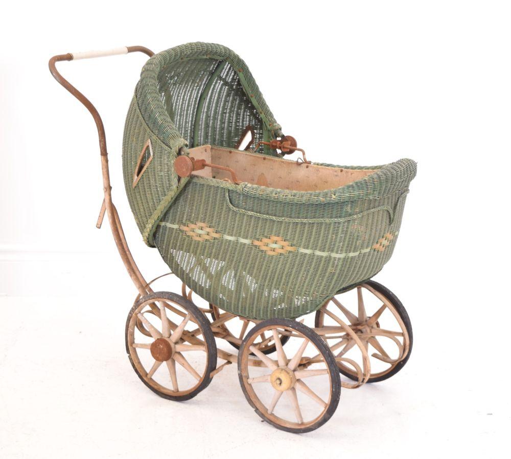 A charming early 20th-century wicker child's pram, of green-painted woven construction with arched hood, mounted on a metal frame with four spoked wooden wheels.
