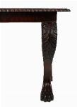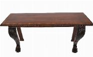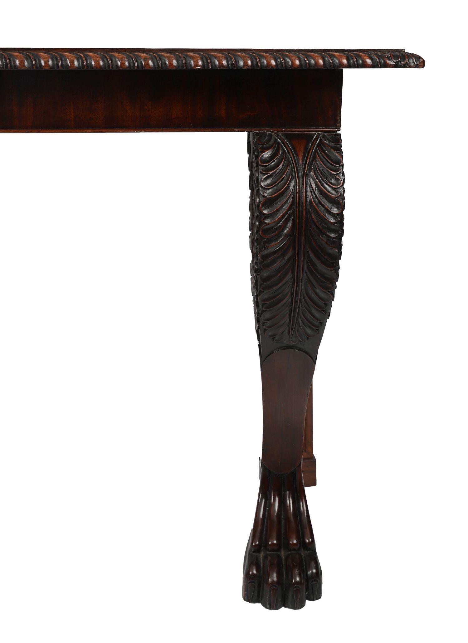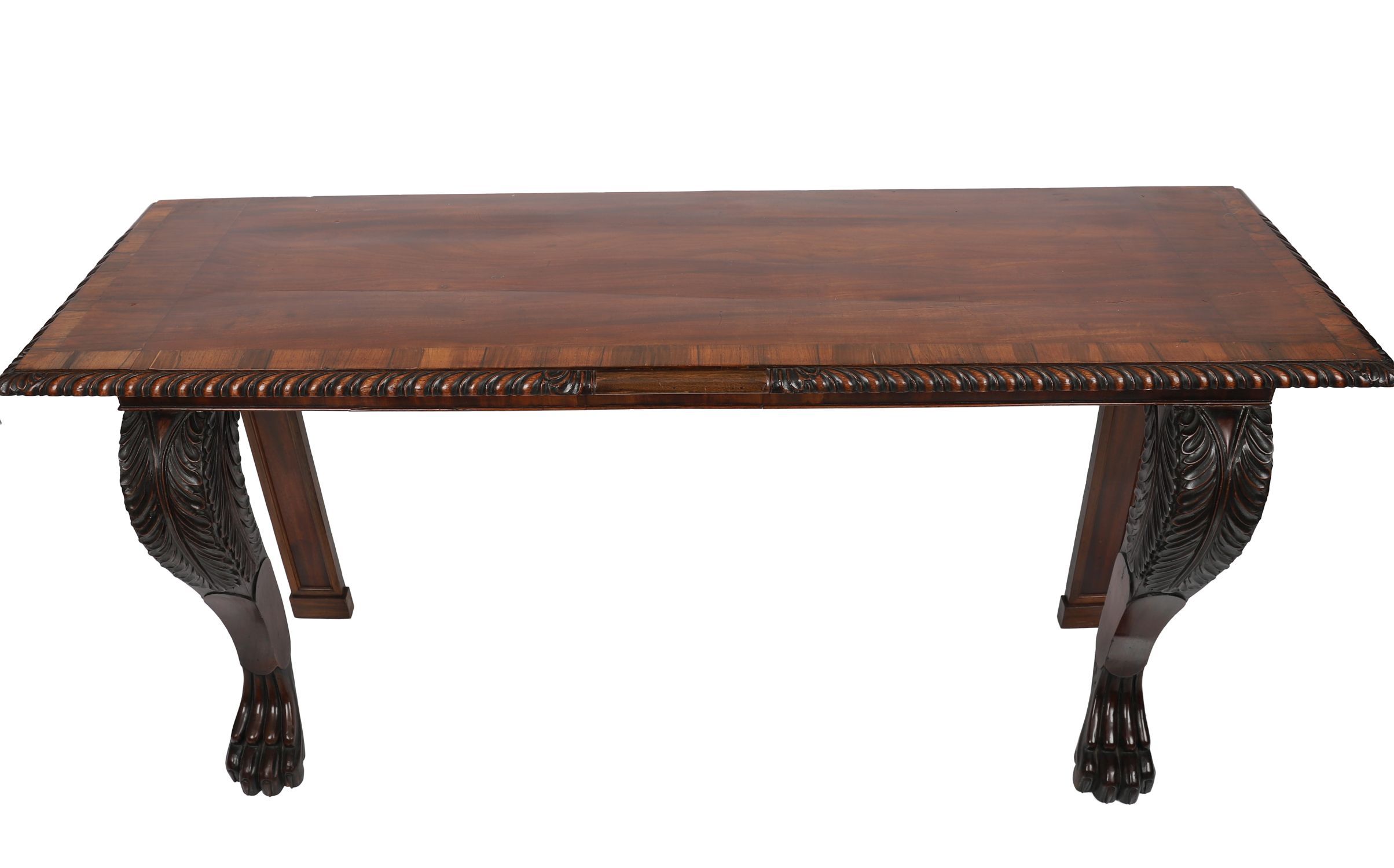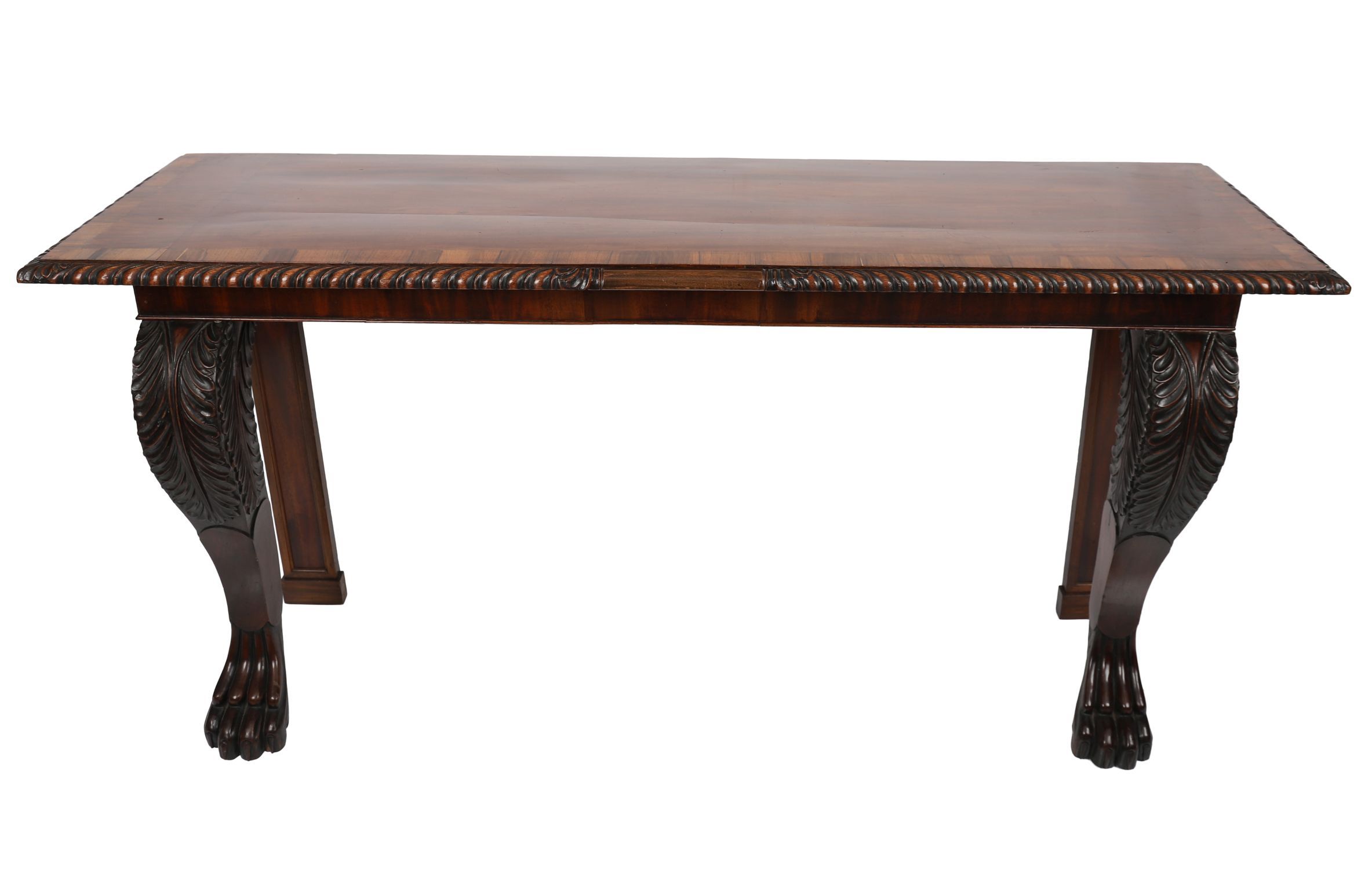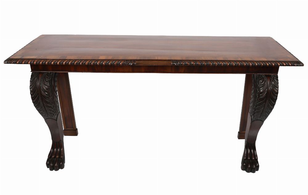 A fine William IV period serving or hall table of bold and sculptural form, the rectangular top veneered in well-figured mahogany with rosewood crossbanding and edged in a pronounced gadrooned moulding. The table is supported to the front by elaborately carved acanthus scroll brackets, terminating in oversized lion's paw feet, while the back legs are square and recessed for wall placement. The plain frieze allows the rich grain of the mahogany to speak, enhanced by the striking contrast of the rosewood borders.