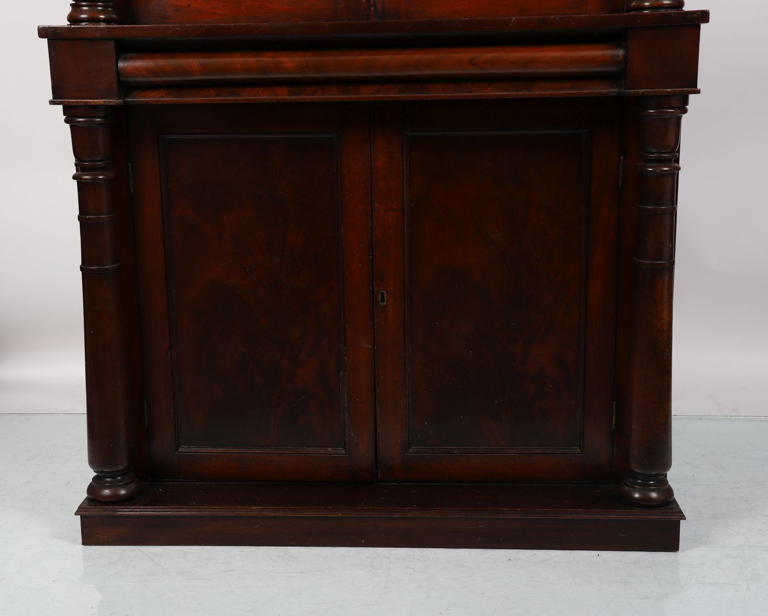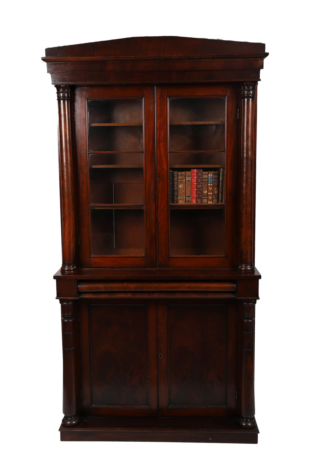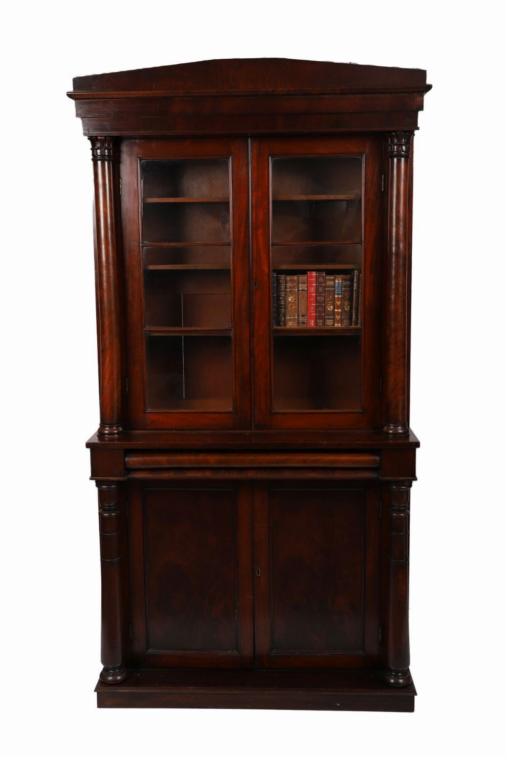 Circa 1835. The moulded cornice above a pair of glazed doors enclosing adjustable shelves, over panelled doors below, flanked by reeded columns and raised on a plinth base.