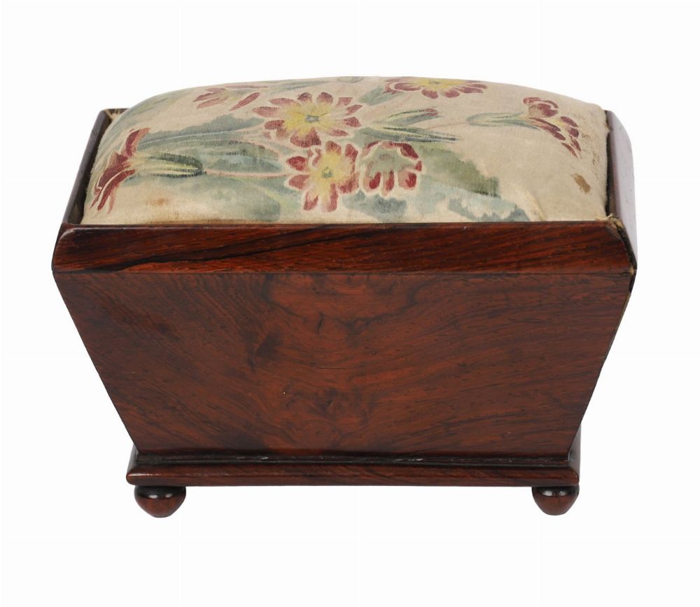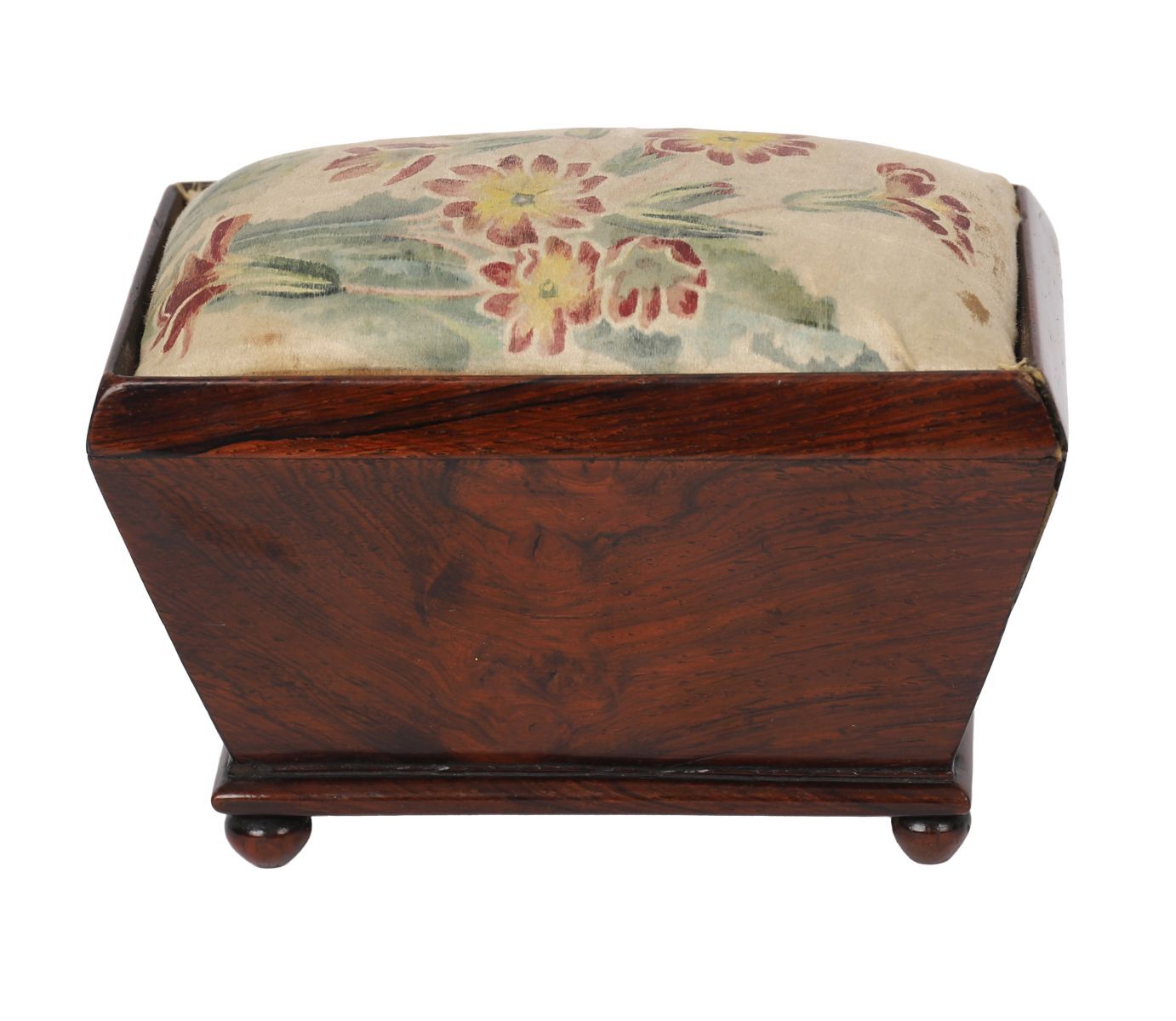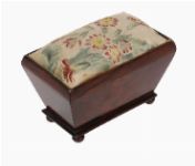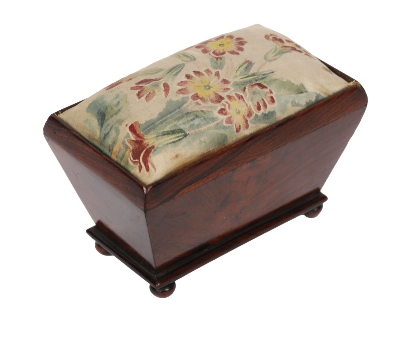 A small William IV mahogany pin cushion box of sarcophagus form, raised on bun feet, with upholstered floral cushion top. Circa 1830.