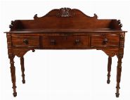 The curved breakfront top below a three-quarter gallery back, above a series of three drawers furnished with turned wooden knobs, raised on turned and reeded legs.
