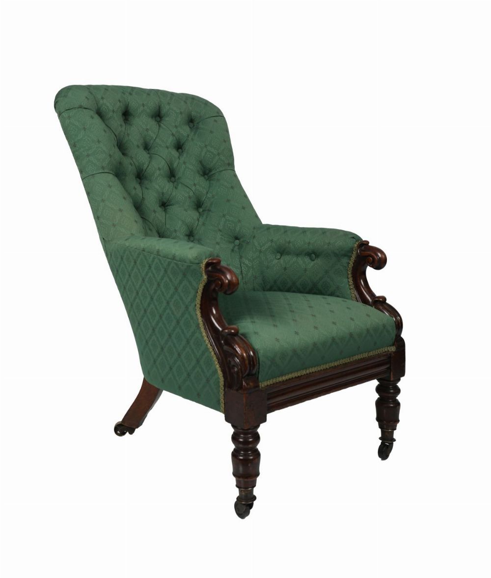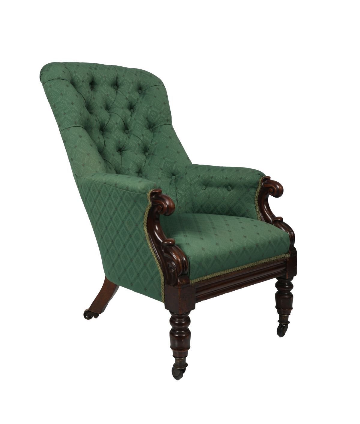 A single William IV mahogany armchair with deep buttoned backrest and scrolled arms, upholstered in green patterned damask fabric with decorative trim, raised on turned and reeded legs with brass castors.