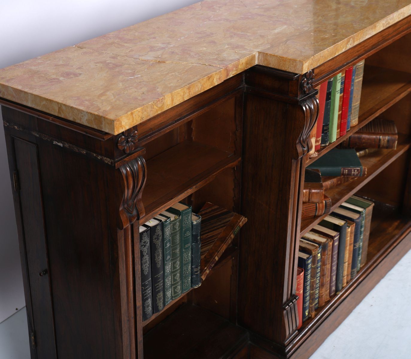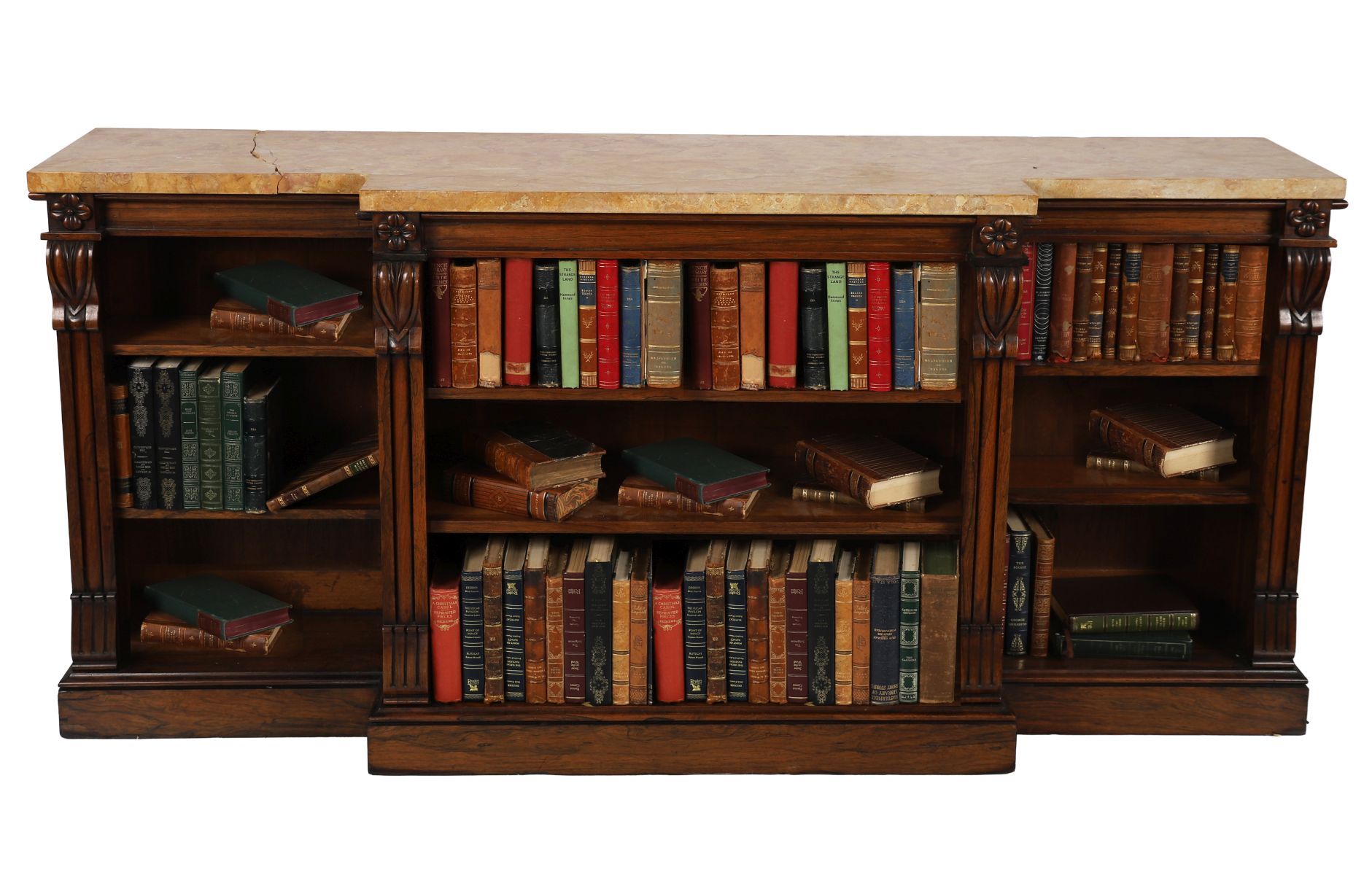 A distinguished William IV period breakfront library bookcase in richly figured rosewood, the rectangular veined marble top over three open sections, the central compartment slightly recessed. Flanked by fluted pilasters with anthemion-carved capitals and raised on a moulded plinth base. The open shelves are adjustable, suited for books or display.