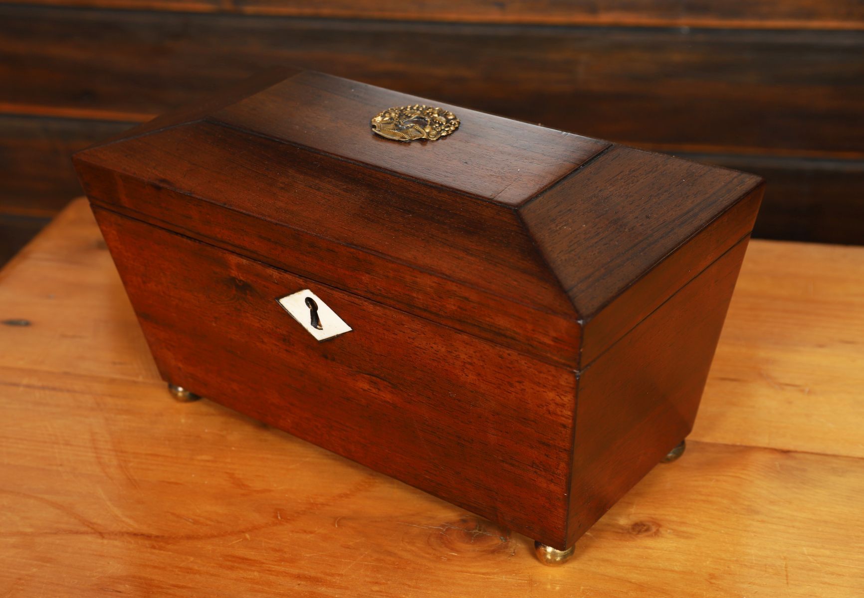 William IV rosewood tea caddy of sarcophagus form, the hinged lid opening to a fitted interior, the exterior with applied brass escutcheon and bun feet. Circa 1830.