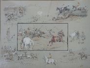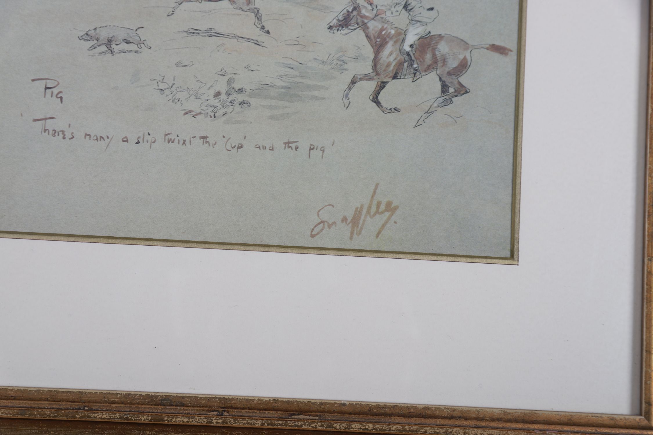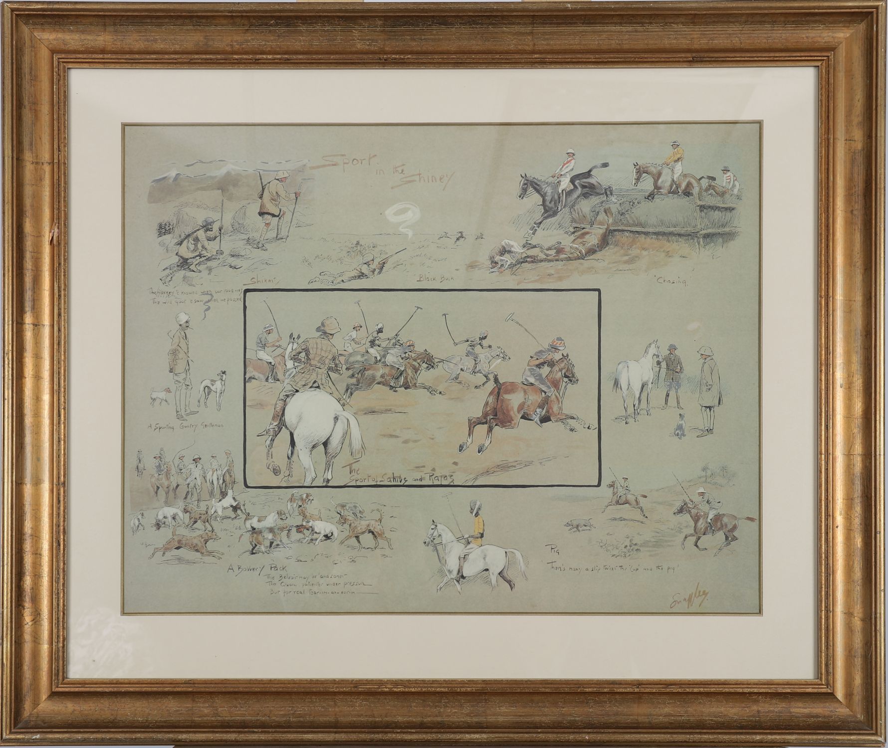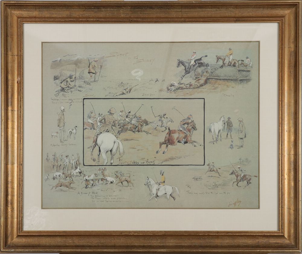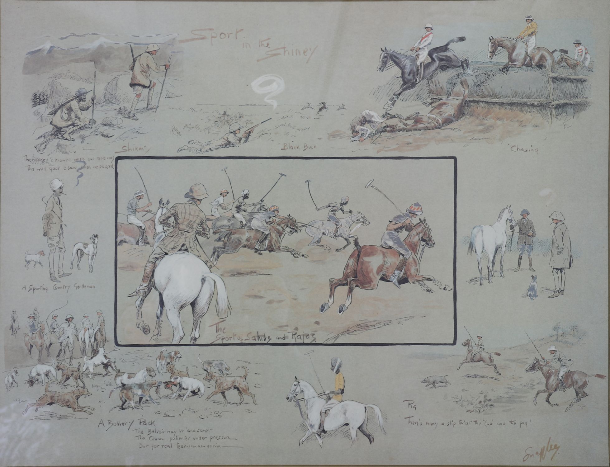 A signed colour print by William Johnson Payne, known as “Snaffles” (1884–1967), depicting colonial sporting scenes under the title The Sport of Sahibs and Rajas. The composition includes vignettes of polo, hunting, pig-sticking and field sports, with humorous inscriptions in the artist’s hand. Signed lower right in pencil. Mounted and framed.
