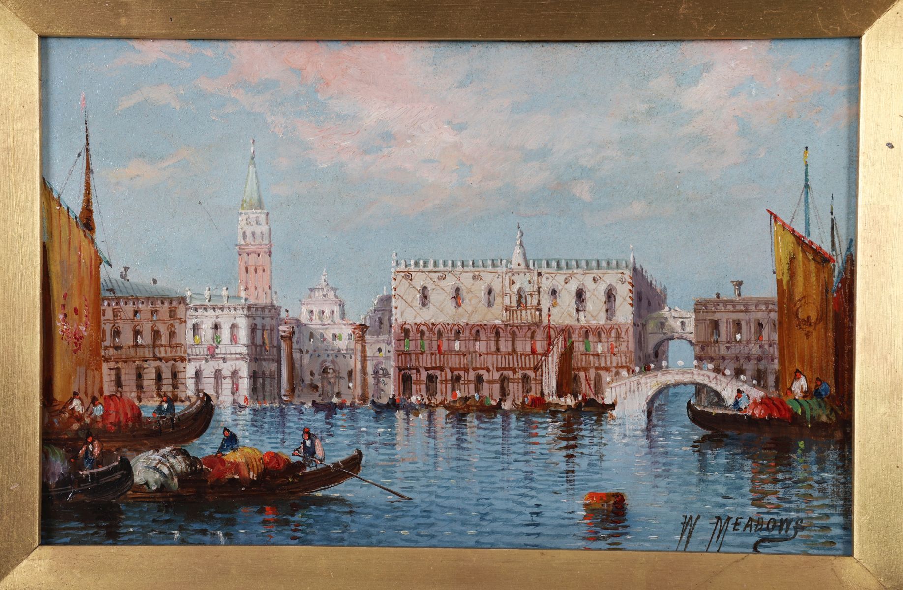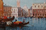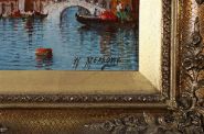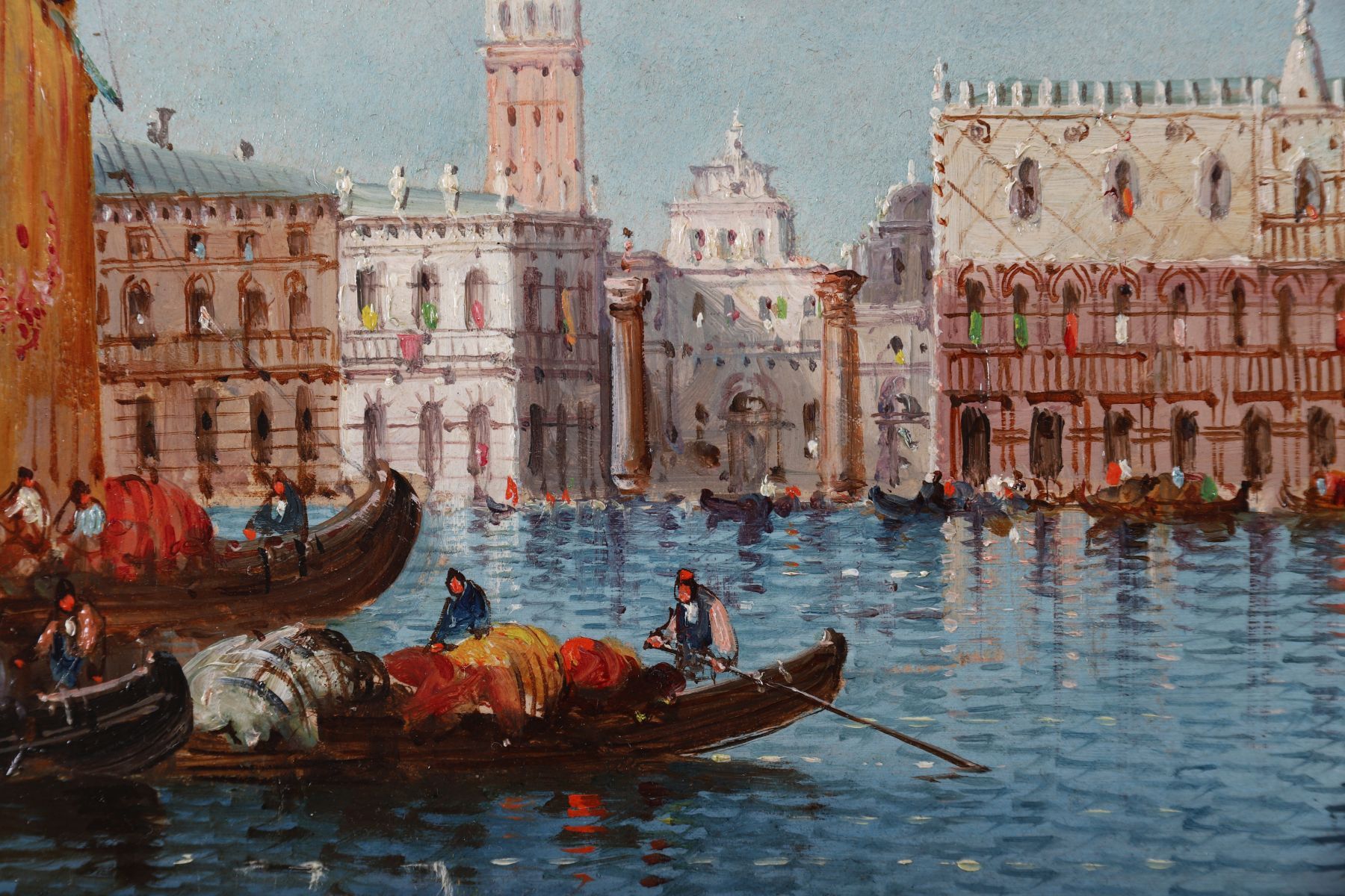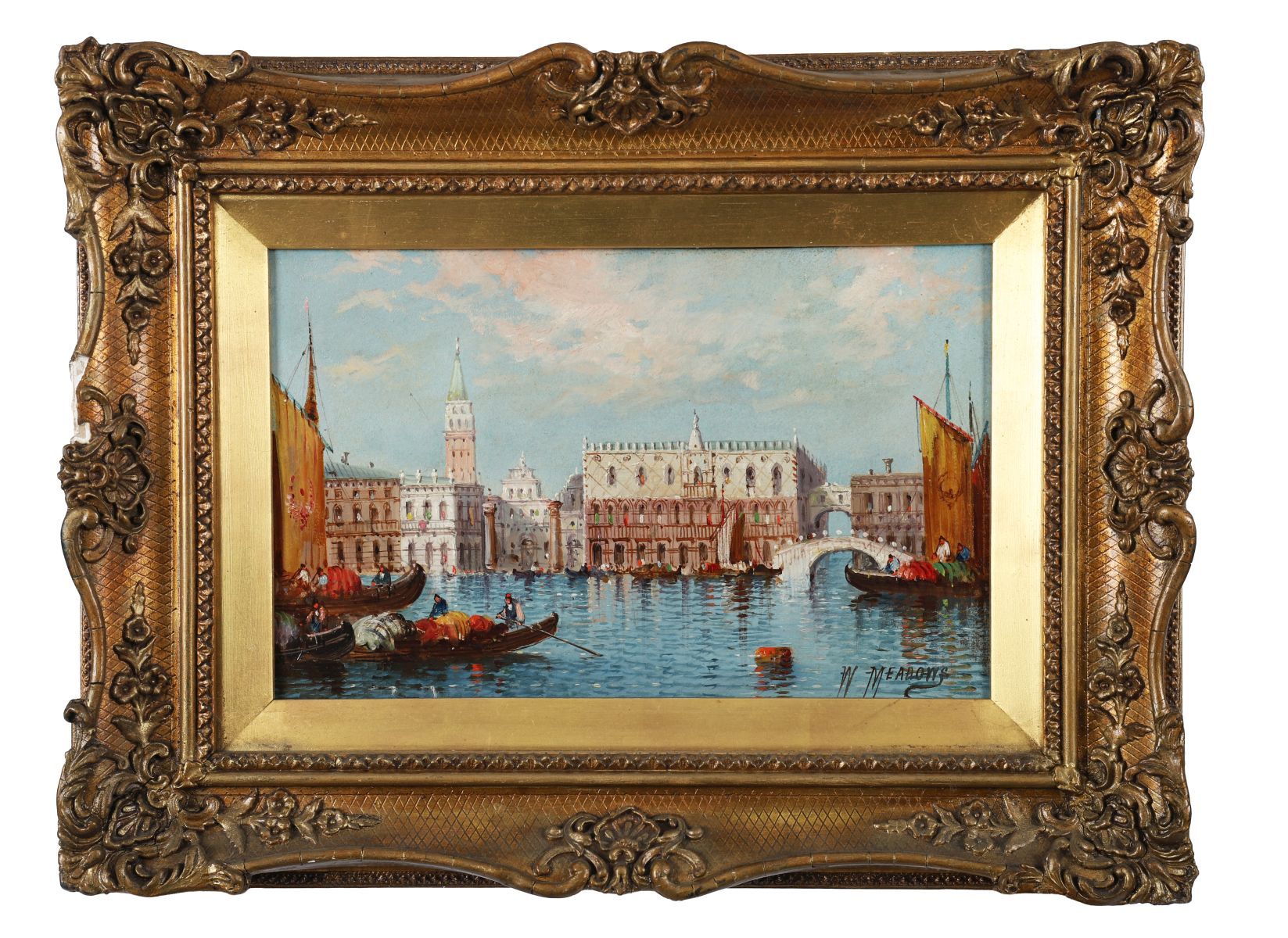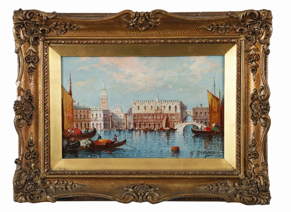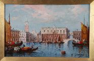 A finely detailed Venetian canal scene depicting gondolas and sailing vessels before the Doge’s Palace and Campanile, under a soft blue sky. Oil on panel, signed lower right. Presented in an ornate gilt frame.