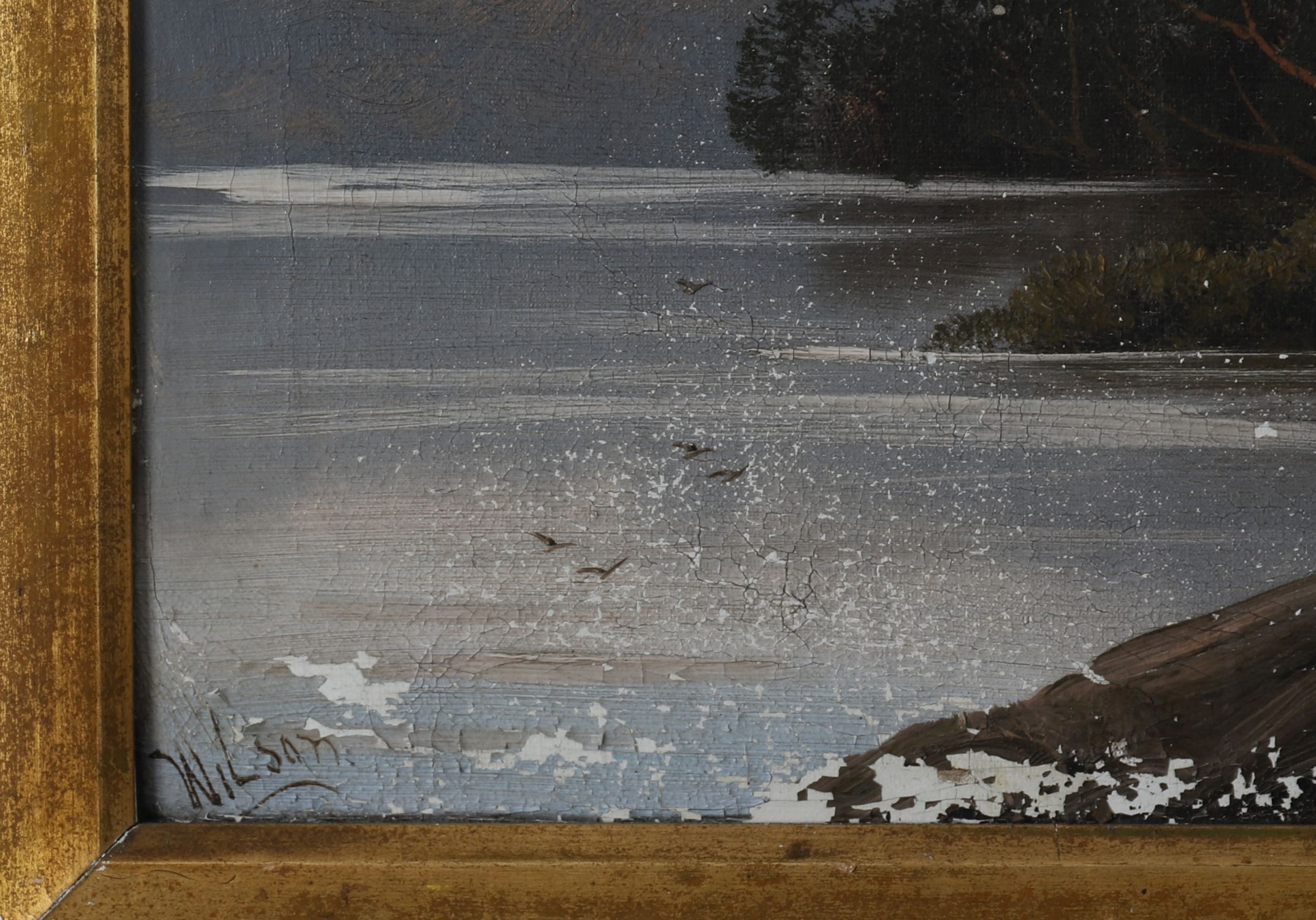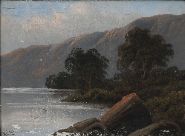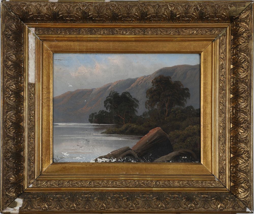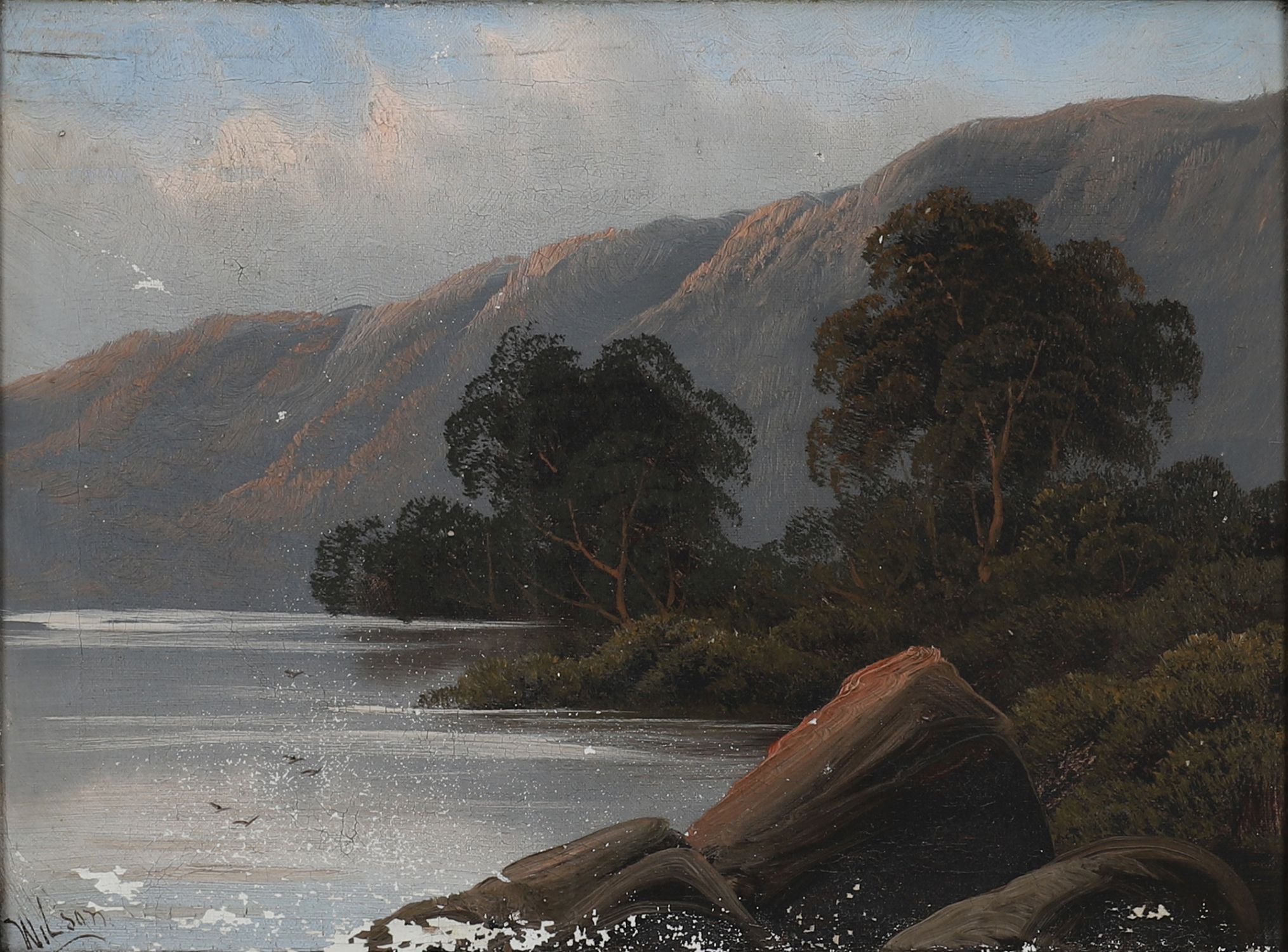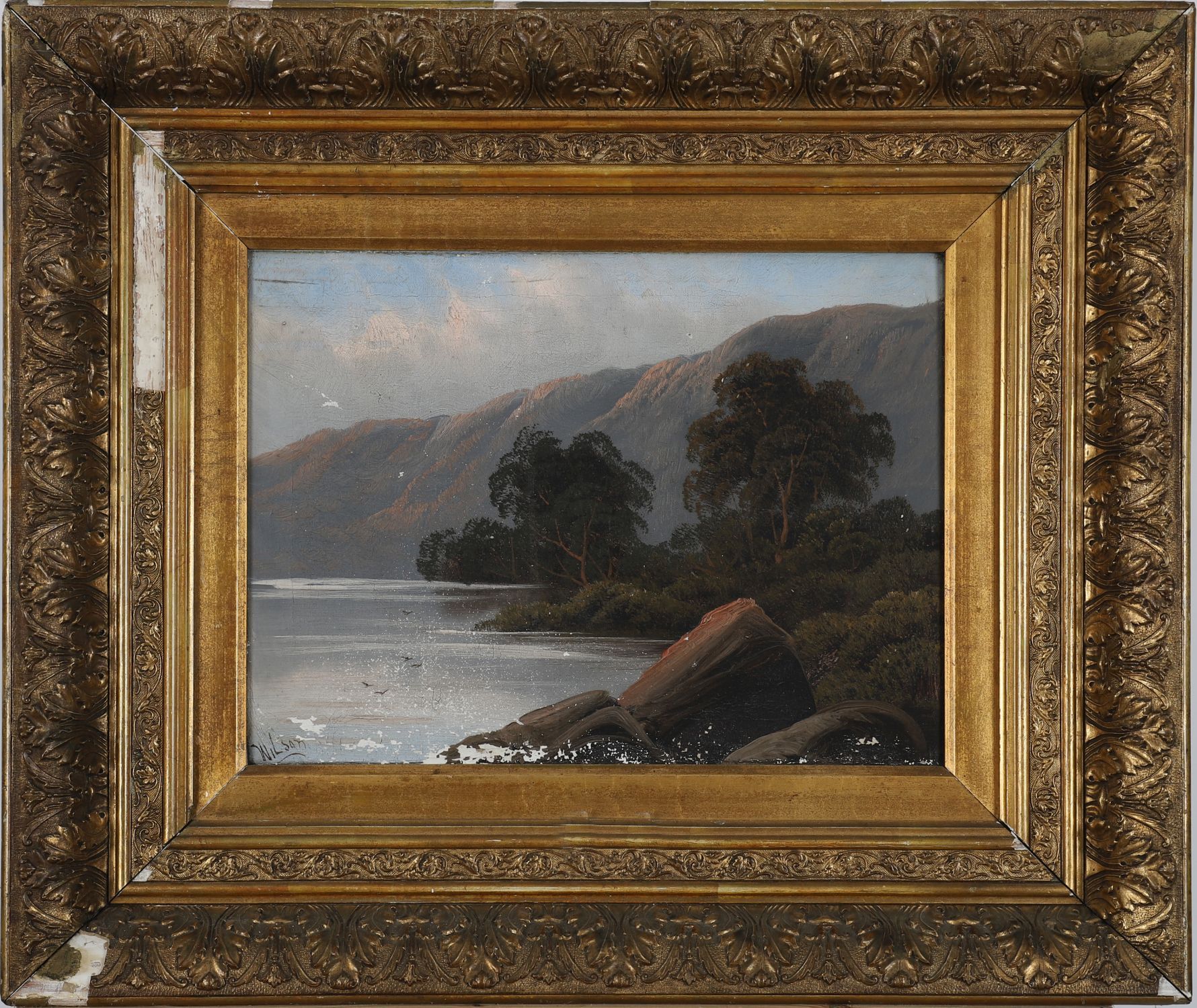 An atmospheric lakeside scene attributed to Wilson, showing a calm expanse of water with trees and mountainous backdrop, framed by rocky outcrops in the foreground. A classic romantic landscape with fine tonal balance.