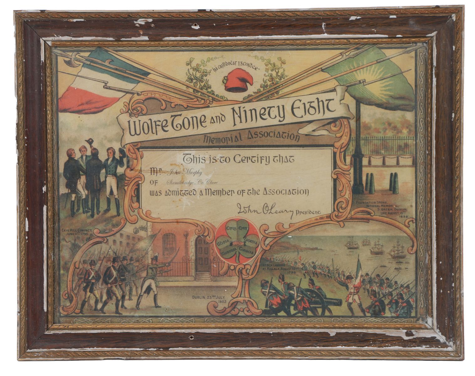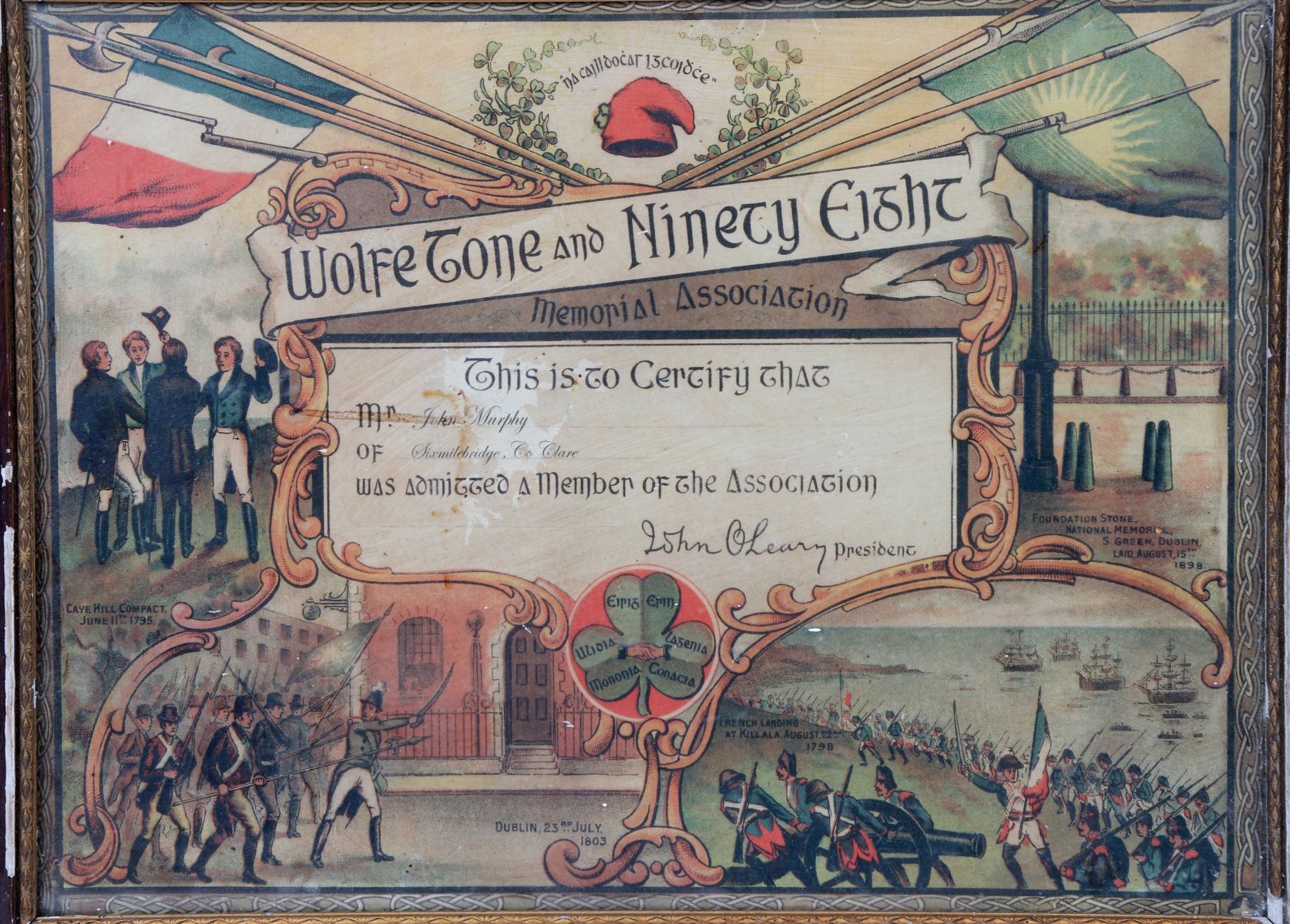 A printed commemorative certificate issued by the Wolfe Tone and Ninety-Eight Memorial Association, decorated with historical vignettes relating to the 1798 Rebellion, framed and glazed.