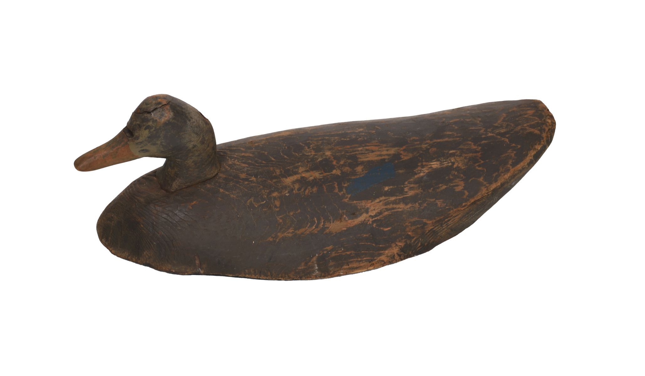 A single carved wooden duck decoy with curved beak and subtly painted surface.