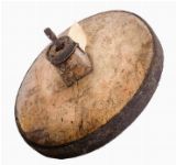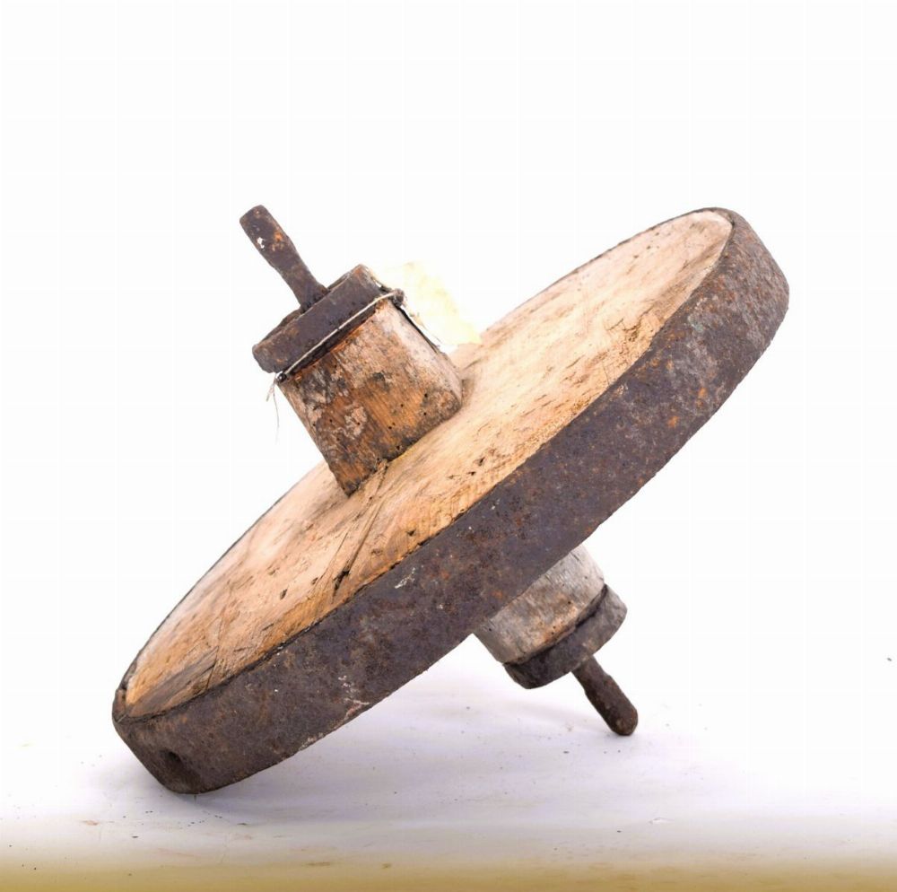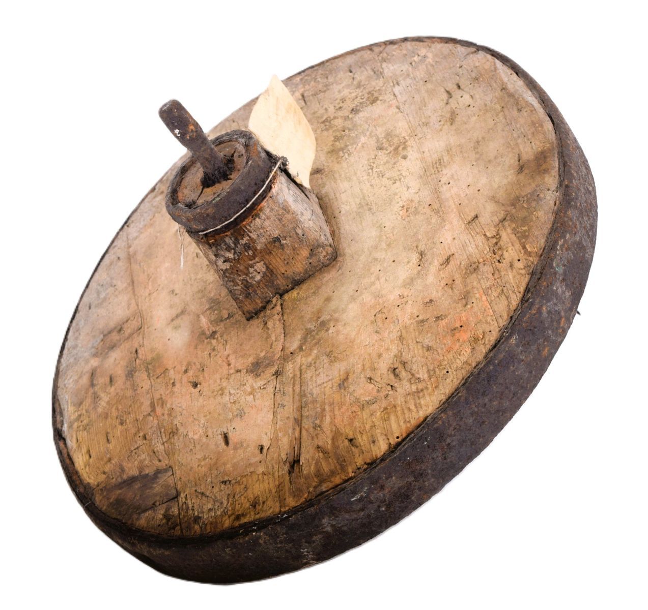 Wooden wheel with iron tyre and metal banding.