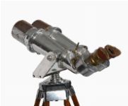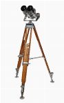 A Second World War Japanese binocular field telescope, constructed in aluminium alloy with twin eyepieces and mounted on an adjustable wooden tripod with metal fittings. The instrument of military pattern, consistent with Japanese optical equipment produced for observation and range-finding purposes during the Pacific theatre.