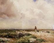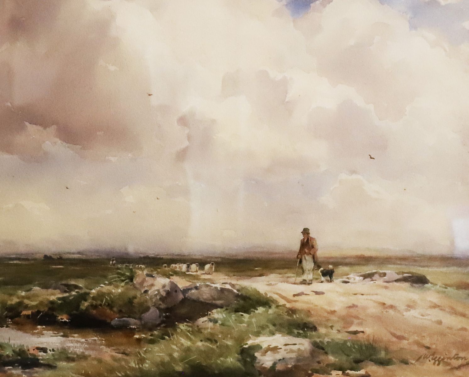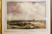 Signed watercolour depicting a shepherd and flock beneath expansive cloud formations. Enclosed in a gilt frame. Watercolour on paper.