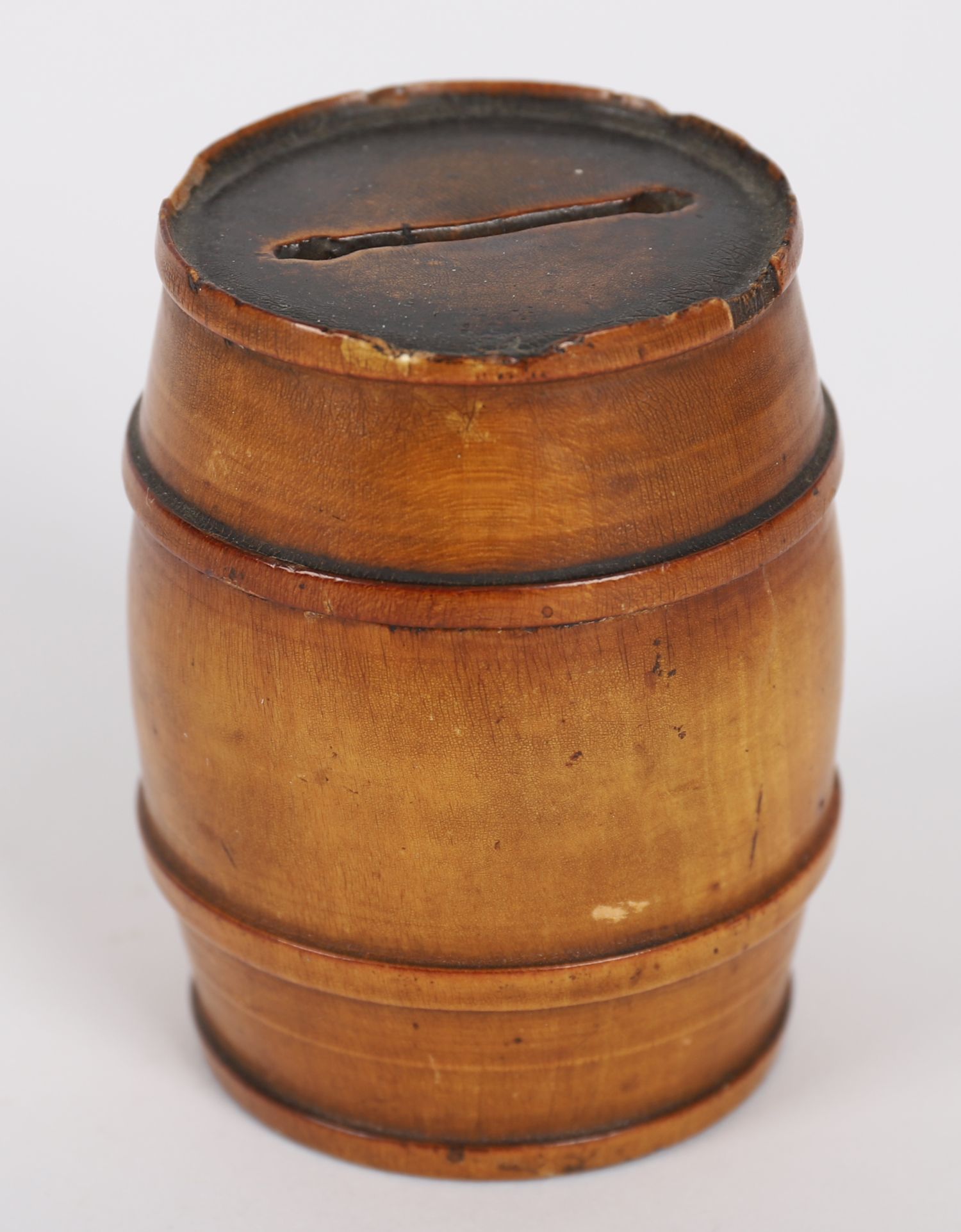 A small yew wood barrel-form money box, the body with a fine mellow patina and fitted with a coin slot to the top. One side applied with a transfer print of a church and town view, now partially worn.