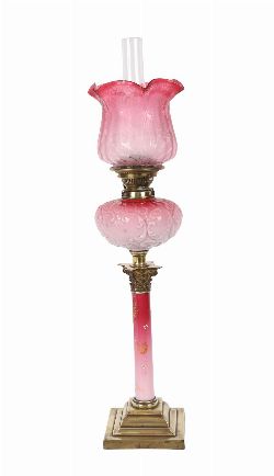 19TH-CENTURY CORINTHIAN PILLARED PINK GLASS AND BRASS OIL LAMP