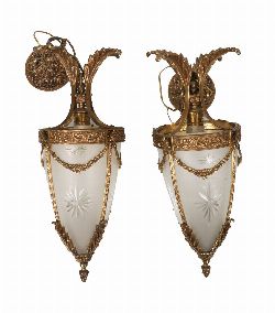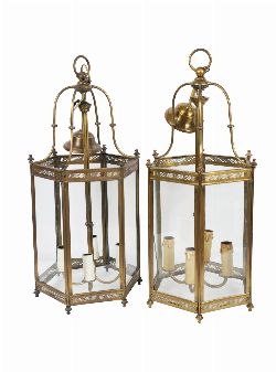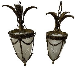 PAIR OF BRASS AND GLASS HANGING LANTERNS