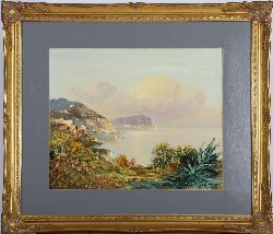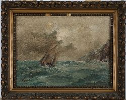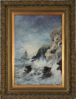J. FERGUSON, ROCKY SHORE WITH SPRAY AND SAILBOATS