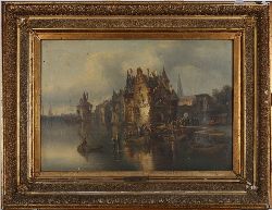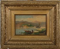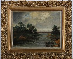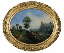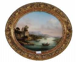 19TH-CENTURY REVERSE PAINTING ON CONVEX GLASS, RIVER LANDSCAPE