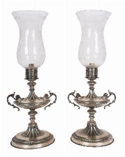 PAIR OF SILVER-PLATED AND GLASS TABLE LAMPS, EARLY 20TH CENTURY
